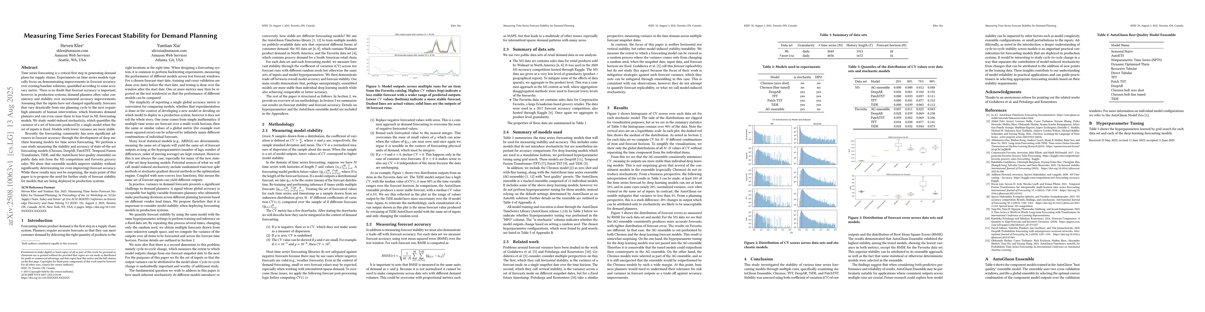 Time series forecasting is a critical first step in generating demand plans for supply chains. Experiments on time series models typically focus on demonstrating improvements in forecast accuracy over existing/baseline solutions, quantified according to some accuracy metric. There is no doubt that forecast accuracy is important; however in production systems, demand planners often value consistency and stability over incremental accuracy improvements. Assuming that the inputs have not changed significantly, forecasts that vary drastically from one planning cycle to the next require high amounts of human intervention, which frustrates demand planners and can even cause them to lose trust in ML forecasting models. We study model-induced stochasticity, which quantifies the variance of a set of forecasts produced by a single model when the set of inputs is fixed. Models with lower variance are more stable. Recently the forecasting community has seen significant advances in forecast accuracy through the development of deep machine learning models for time series forecasting. We perform a case study measuring the stability and accuracy of state-of-the-art forecasting models (Chronos, DeepAR, PatchTST, Temporal Fusion Transformer, TiDE, and the AutoGluon best quality ensemble) on public data sets from the M5 competition and Favorita grocery sales. We show that ensemble models improve stability without significantly deteriorating (or even improving) forecast accuracy. While these results may not be surprising, the main point of this paper is to propose the need for further study of forecast stability for models that are being deployed in production systems.