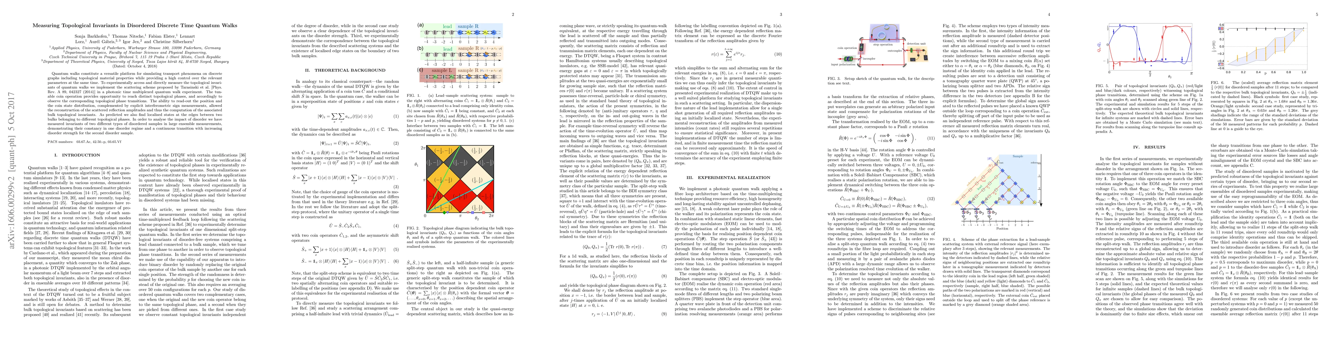This paper experimentally measures topological invariants in disordered discrete time quantum walks using a photonic quantum walk setup. The study observes topological phase transitions and localized edge states, demonstrating the robustness of invariants under different disorder regimes.