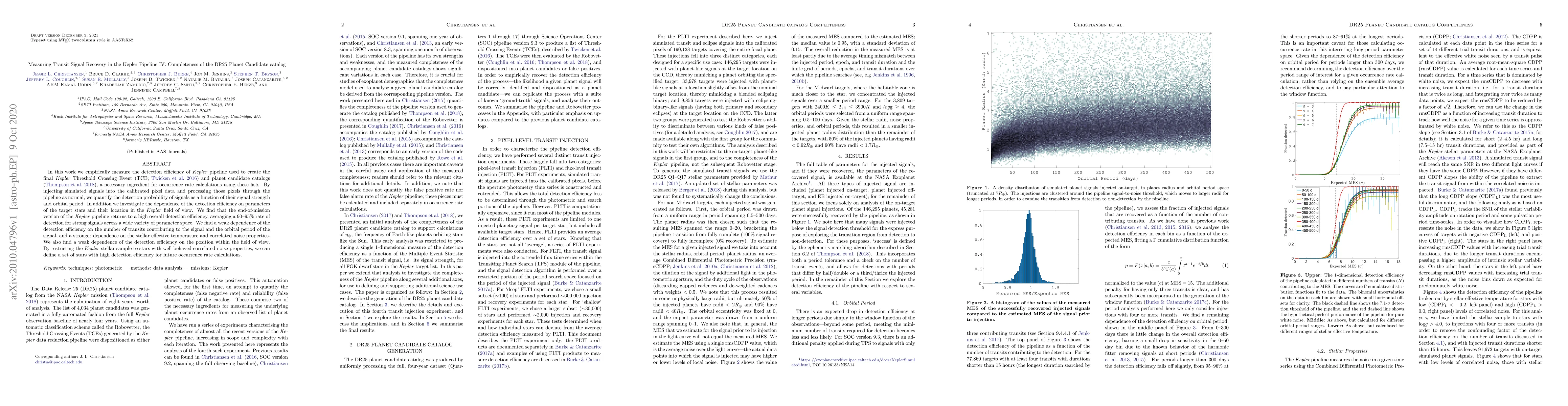 This study measures the detection efficiency of the Kepler pipeline for planet candidate catalogs, finding an overall 90-95% detection rate for strong signals. It reveals a weak dependence on transit number and orbital period, but a stronger dependence on stellar temperature and correlated noise, with minor positional effects in the field of view.