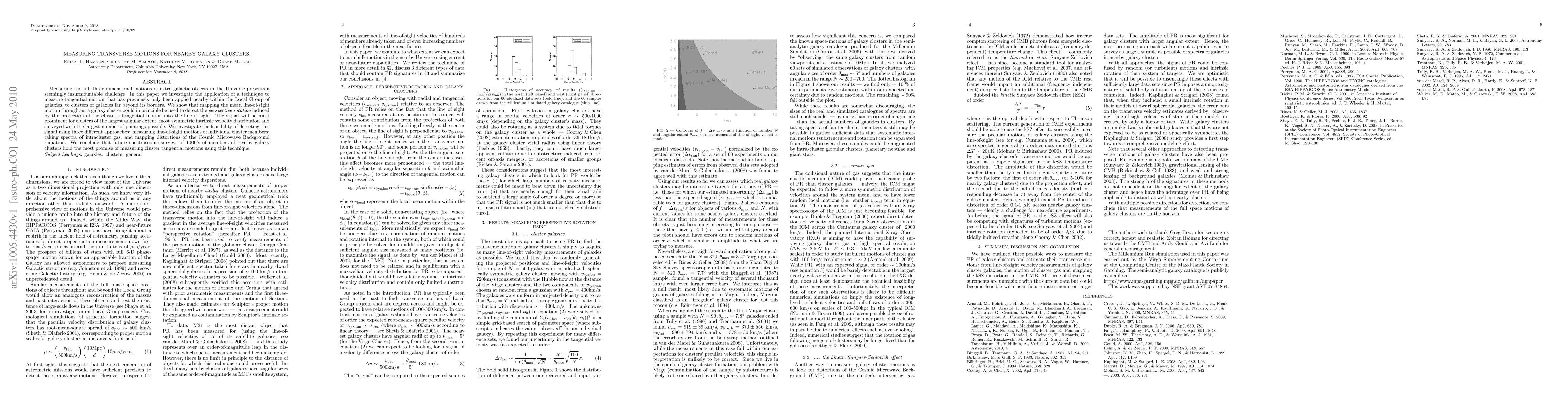 This paper explores a technique to measure tangential motions in nearby galaxy clusters, extending a method previously used in the Local Group. It concludes that future spectroscopic surveys of numerous cluster members offer the best potential for detecting the "perspective rotation" induced by tangential motion.