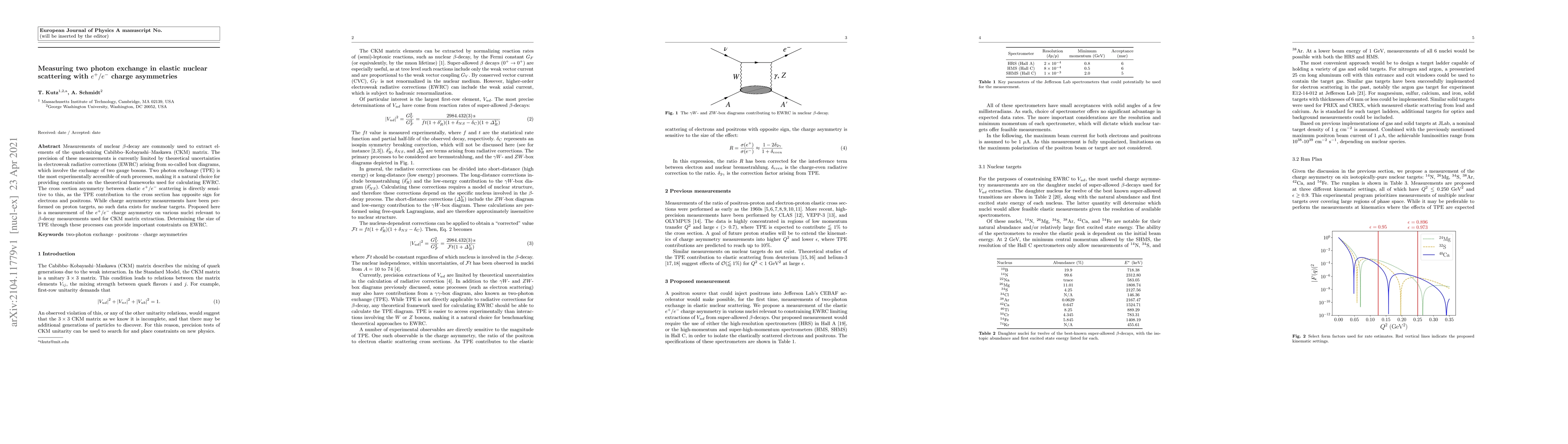This paper proposes measuring the $e^+/e^-$ charge asymmetry in elastic nuclear scattering to determine the contribution of two photon exchange (TPE) to electroweak radiative corrections, which are crucial for precise extraction of elements in the CKM matrix from nuclear $\beta$-decay measurements. The absence of such data for nuclear targets makes this study particularly significant for constraining theoretical frameworks.