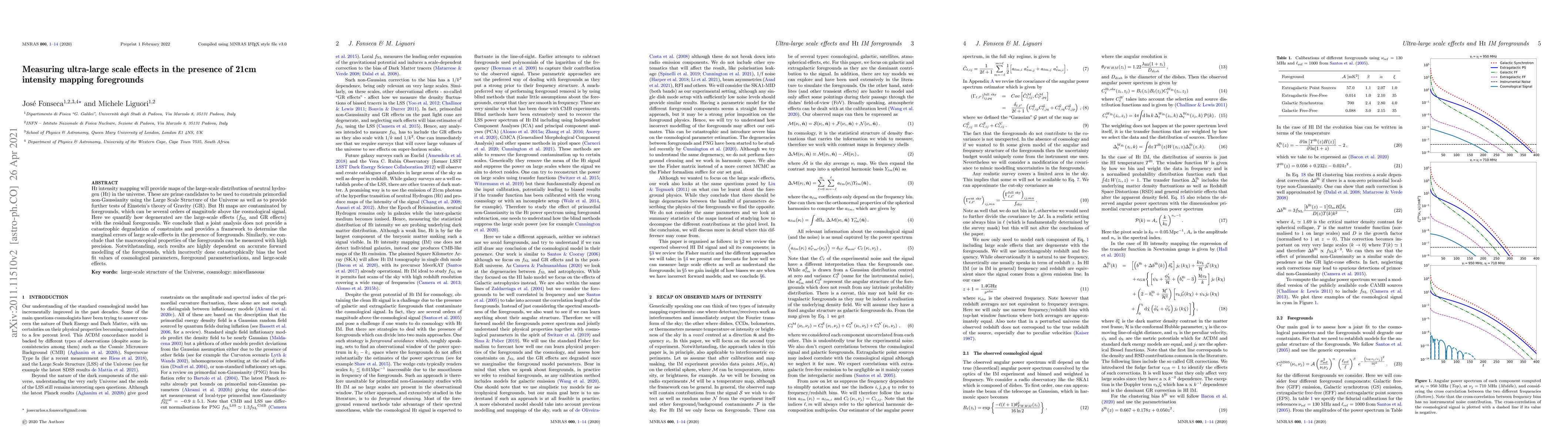 \textsc{Hi} intensity mapping will provide maps of the large-scale distribution of neutral hydrogen (\textsc{Hi}) in the universe. These are prime candidates to be used to constrain primordial non-Gaussianity using the Large Scale Structure of the Universe as well as to provide further tests of Einstein's theory of Gravity (GR). But \textsc{Hi} maps are contaminated by foregrounds, which can be several orders of magnitude above the cosmological signal. Here we quantify how degenerated are the large-scale effects ($f_{\rm NL}$ and GR effects) with the residual foregrounds. We conclude that a joint analysis does not provide a catastrophic degradation of constraints and provides a framework to determine the marginal errors of large scale-effects in the presence of foregrounds. Similarly, we conclude that the macroscopical properties of the foregrounds can be measured with high precision. Notwithstanding, such results are highly dependent on accurate forward modelling of the foregrounds, which incorrectly done catastrophically bias the best fit values of cosmological parameters, foreground parameterisations, and large-scale effects.