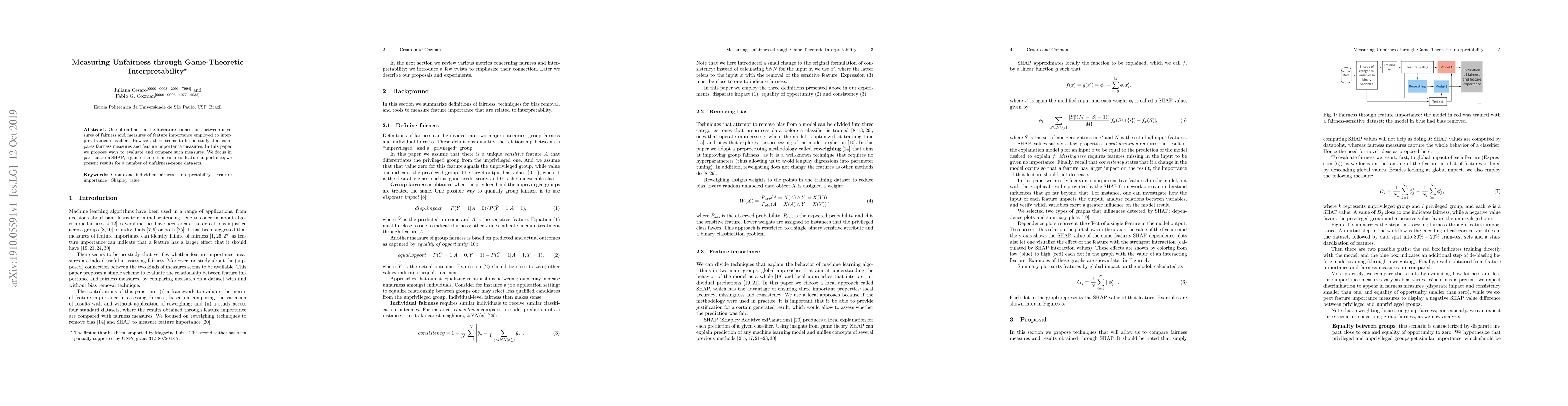This paper proposes methods to evaluate and compare fairness measures with feature importance measures, specifically focusing on SHAP, a game-theoretic measure of feature importance. It presents comparative results on several datasets known for unfairness issues.