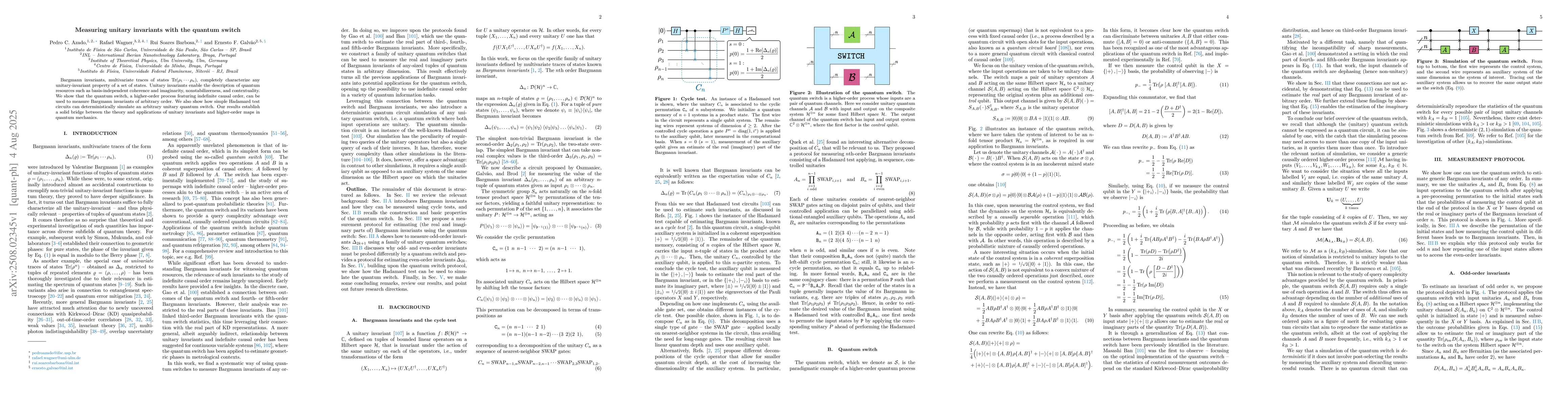 Bargmann invariants, multivariate traces of states, completely characterize any unitary-invariant property of a set of states. Unitary invariants enable the description of quantum resources such as basis-independent coherence and imaginarity, nonstabilizerness, and contextuality. We show that the quantum switch, a higher-order process featuring indefinite causal order, can be used to measure Bargmann invariants of arbitrary order. We also show how simple Hadamard test circuits can deterministically simulate an arbitrary unitary quantum switch. Our results establish a solid bridge between the theory and applications of unitary invariants and higher-order maps in quantum mechanics.