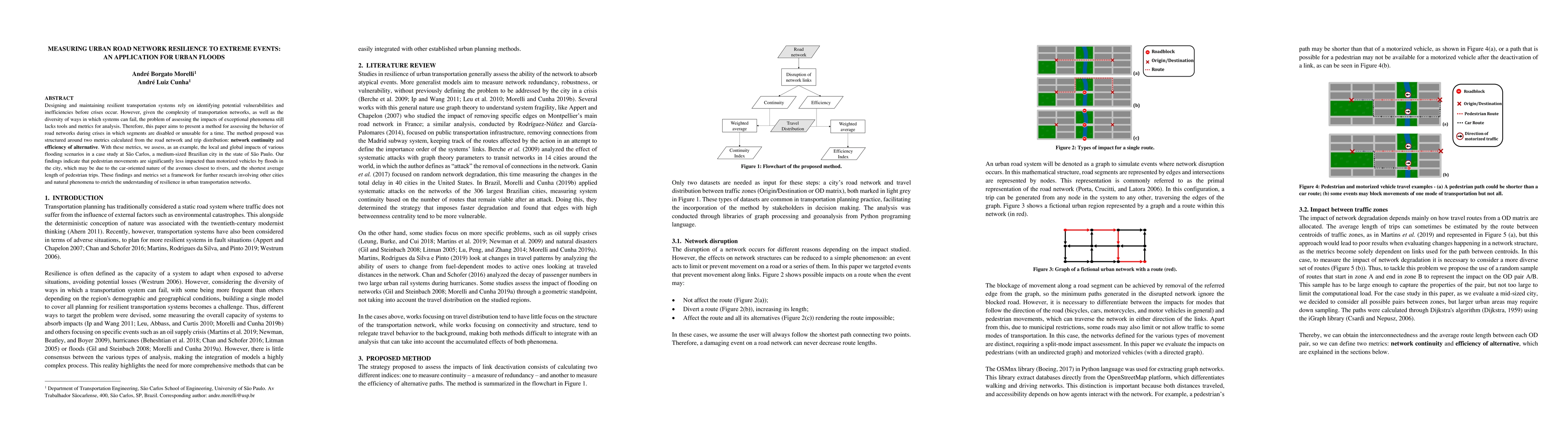 This paper proposes a method to evaluate urban road network resilience using network continuity and alternative efficiency metrics, applying it to assess flood impacts in S~ao Carlos, Brazil. Findings show that pedestrian routes are less affected than motorized routes, highlighting the car-oriented infrastructure and shorter pedestrian trip lengths.