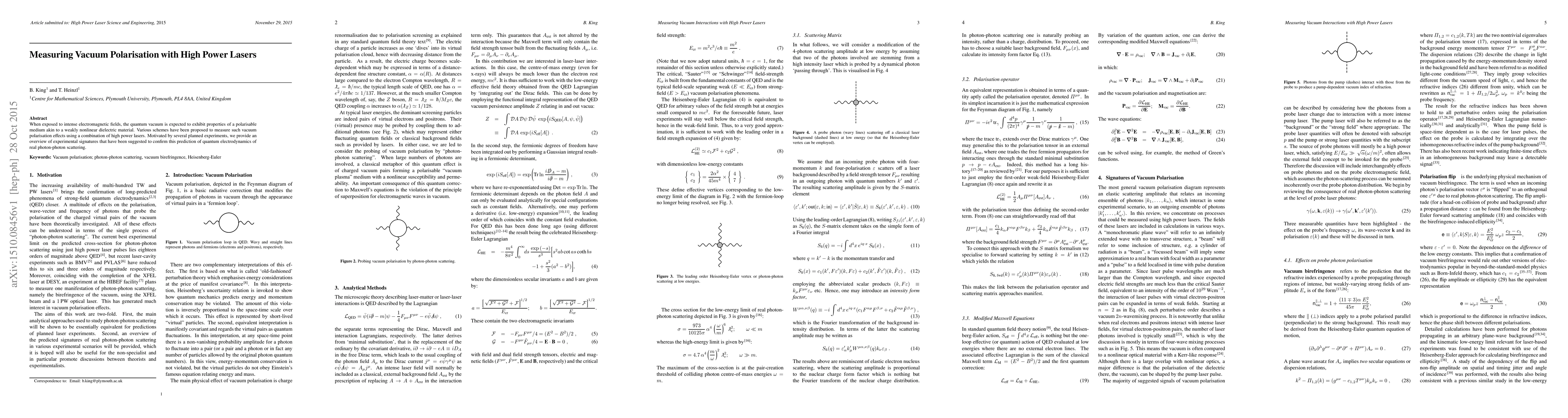 The paper provides an overview of experimental signatures to confirm vacuum polarisation effects using high-power lasers, based on the prediction of real photon-photon scattering in quantum electrodynamics.