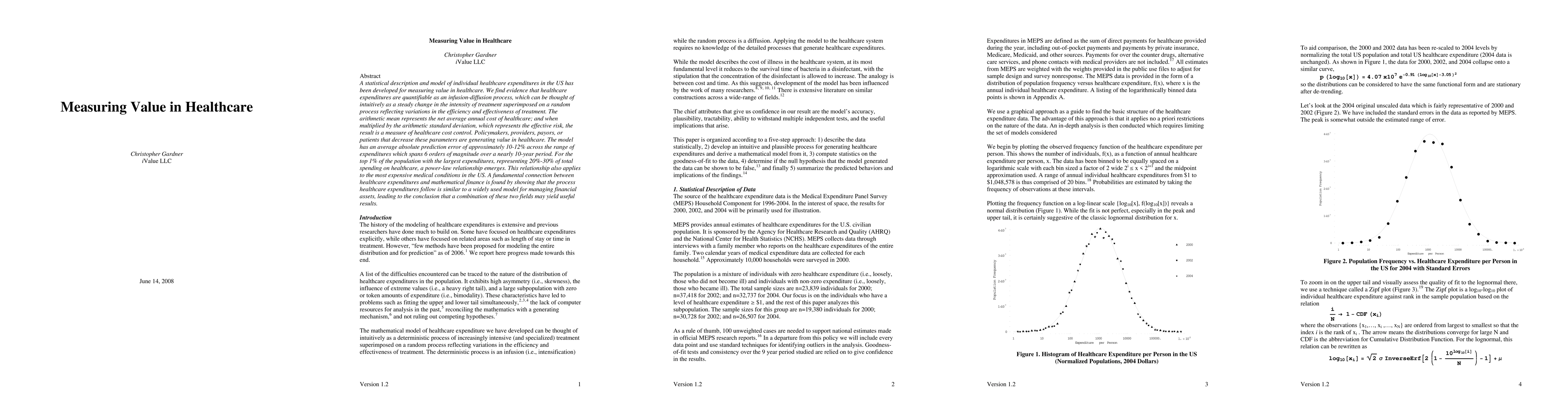 A statistical description and model of individual healthcare expenditures in the US has been developed for measuring value in healthcare. We find evidence that healthcare expenditures are quantifiable as an infusion-diffusion process, which can be thought of intuitively as a steady change in the intensity of treatment superimposed on a random process reflecting variations in the efficiency and effectiveness of treatment. The arithmetic mean represents the net average annual cost of healthcare; and when multiplied by the arithmetic standard deviation, which represents the effective risk, the result is a measure of healthcare cost control. Policymakers, providers, payors, or patients that decrease these parameters are generating value in healthcare. The model has an average absolute prediction error of approximately 10-12% across the range of expenditures which spans 6 orders of magnitude over a nearly 10-year period. For the top 1% of the population with the largest expenditures, representing 20%-30% of total spending on healthcare, a power-law relationship emerges. This relationship also applies to the most expensive medical conditions in the US. A fundamental connection between healthcare expenditures and mathematical finance is found by showing that the process healthcare expenditures follow is similar to a widely used model for managing financial assets, leading to the conclusion that a combination of these two fields may yield useful results.