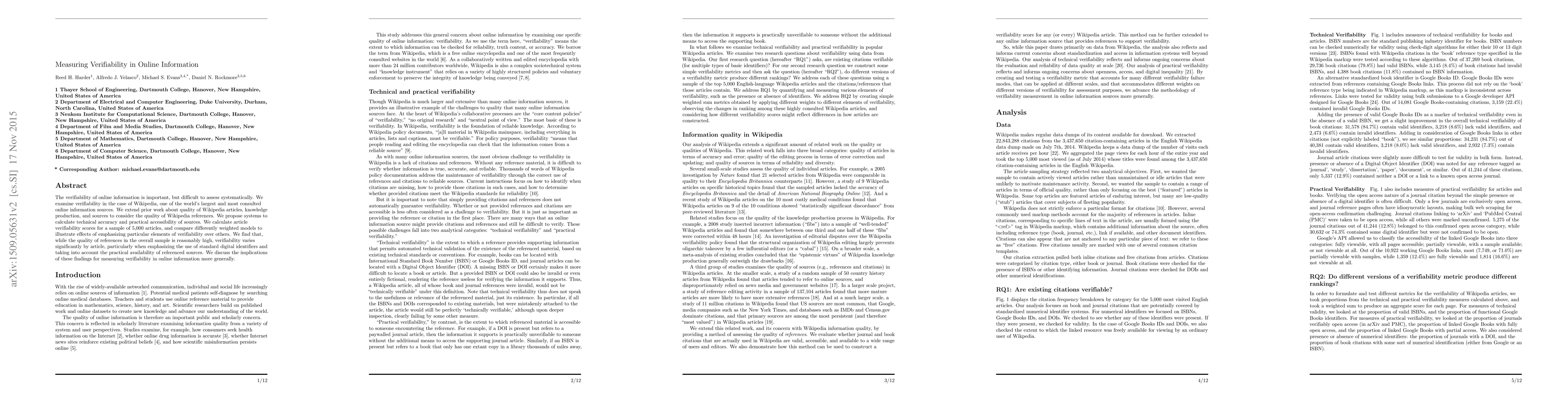 This paper proposes a multidimensional measure to assess the verifiability of Wikipedia articles, focusing on the technical accuracy and accessibility of references. The study finds significant variability in verifiability across articles, highlighting the importance of digital identifiers and source availability.
