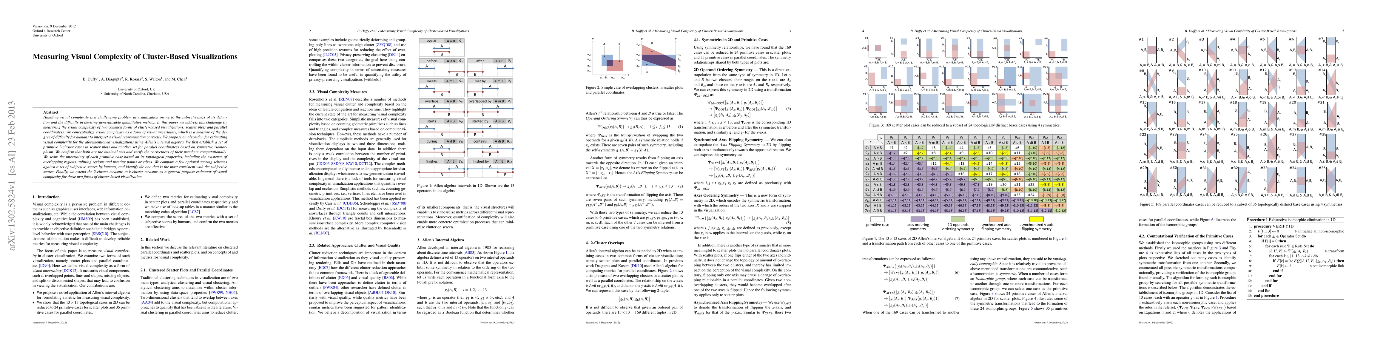 Handling visual complexity is a challenging problem in visualization owing to the subjectiveness of its definition and the difficulty in devising generalizable quantitative metrics. In this paper we address this challenge by measuring the visual complexity of two common forms of cluster-based visualizations: scatter plots and parallel coordinatess. We conceptualize visual complexity as a form of visual uncertainty, which is a measure of the degree of difficulty for humans to interpret a visual representation correctly. We propose an algorithm for estimating visual complexity for the aforementioned visualizations using Allen's interval algebra. We first establish a set of primitive 2-cluster cases in scatter plots and another set for parallel coordinatess based on symmetric isomorphism. We confirm that both are the minimal sets and verify the correctness of their members computationally. We score the uncertainty of each primitive case based on its topological properties, including the existence of overlapping regions, splitting regions and meeting points or edges. We compare a few optional scoring schemes against a set of subjective scores by humans, and identify the one that is the most consistent with the subjective scores. Finally, we extend the 2-cluster measure to k-cluster measure as a general purpose estimator of visual complexity for these two forms of cluster-based visualization.