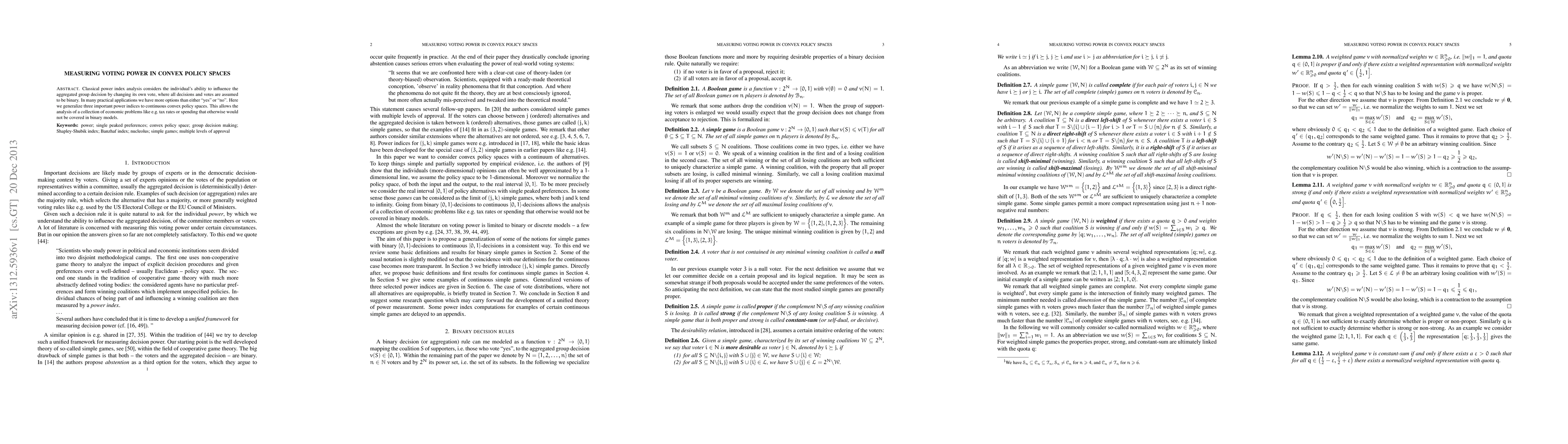 Classical power index analysis considers the individual's ability to influence the aggregated group decision by changing its own vote, where all decisions and votes are assumed to be binary. In many practical applications we have more options than either "yes" or "no". Here we generalize three important power indices to continuous convex policy spaces. This allows the analysis of a collection of economic problems like e.g. tax rates or spending that otherwise would not be covered in binary models.