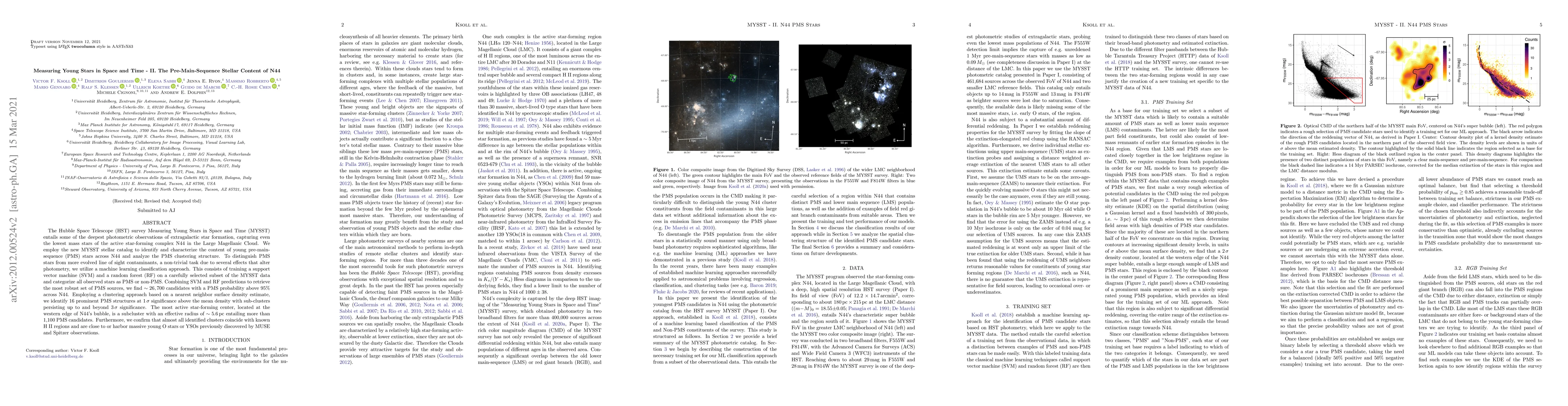 The Hubble Space Telescope (HST) survey Measuring Young Stars in Space and Time (MYSST) entails some of the deepest photometric observations of extragalactic star formation, capturing even the lowest mass stars of the active star-forming complex N44 in the Large Magellanic Cloud. We employ the new MYSST stellar catalog to identify and characterize the content of young pre-main-sequence (PMS) stars across N44 and analyze the PMS clustering structure. To distinguish PMS stars from more evolved line of sight contaminants, a non-trivial task due to several effects that alter photometry, we utilize a machine learning classification approach. This consists of training a support vector machine (SVM) and a random forest (RF) on a carefully selected subset of the MYSST data and categorize all observed stars as PMS or non-PMS. Combining SVM and RF predictions to retrieve the most robust set of PMS sources, we find $\sim26,700$ candidates with a PMS probability above 95% across N44. Employing a clustering approach based on a nearest neighbor surface density estimate, we identify 18 prominent PMS structures at $1$ $\sigma$ significance above the mean density with sub-clusters persisting up to and beyond $3$ $\sigma$ significance. The most active star-forming center, located at the western edge of N44's bubble, is a subcluster with an effective radius of $\sim 5.6$ pc entailing more than 1,100 PMS candidates. Furthermore, we confirm that almost all identified clusters coincide with known H II regions and are close to or harbor massive young O stars or YSOs previously discovered by MUSE and Spitzer observations.