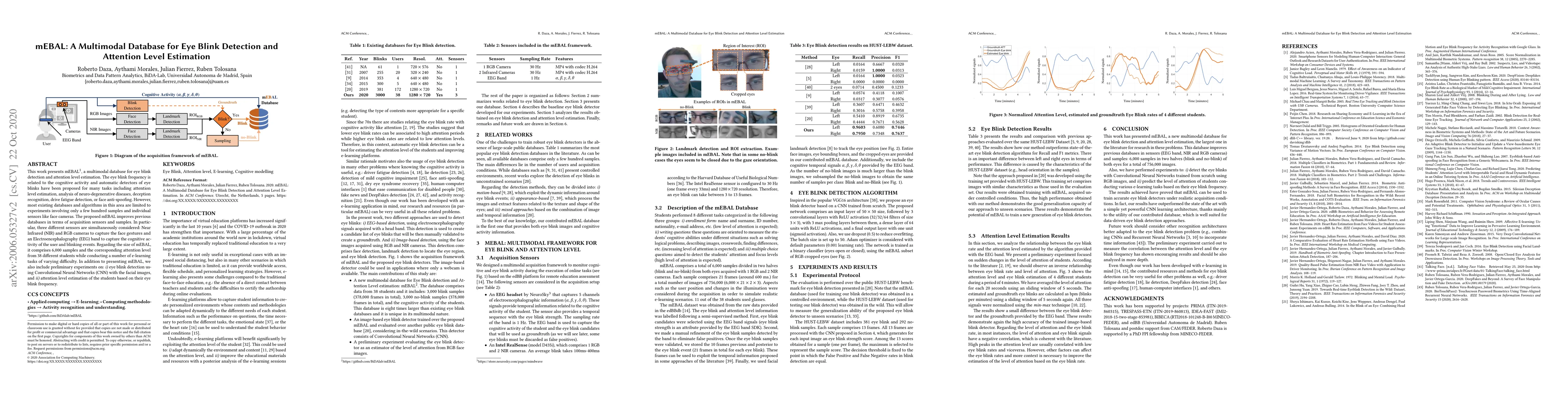 mEBAL is a multimodal database for eye blink detection and attention level estimation, utilizing NIR and RGB cameras and EEG sensors. It comprises 6,000 samples from 38 students, enabling advanced analysis of cognitive activity and attention through CNNs and eye blink frequency.
