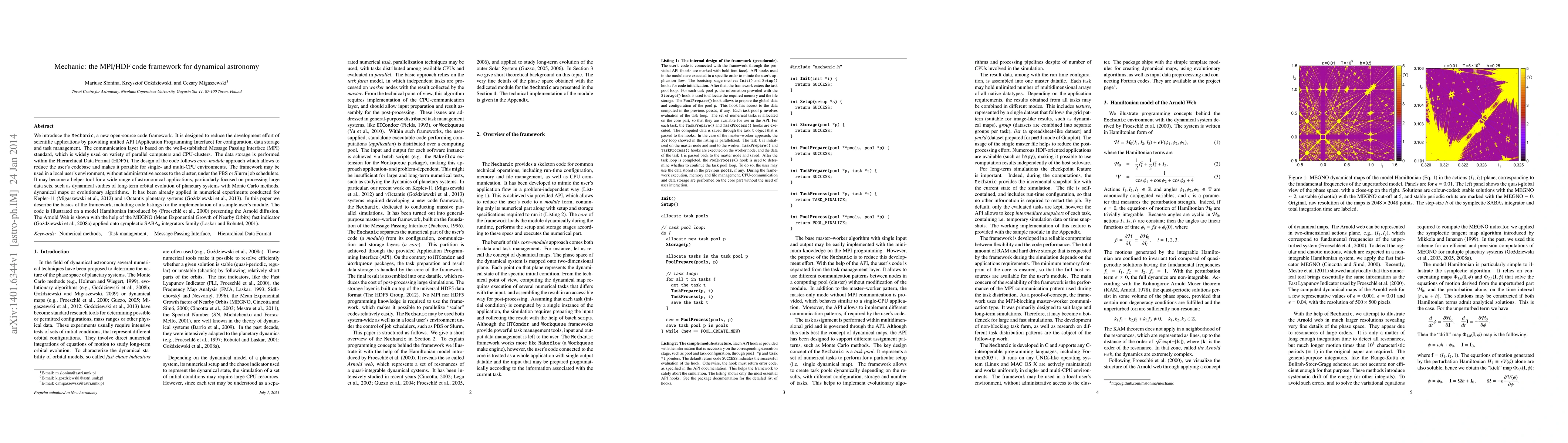 We introduce the Mechanic, a new open-source code framework. It is designed to reduce the development effort of scientific applications by providing unified API (Application Programming Interface) for configuration, data storage and task management. The communication layer is based on the well-established Message Passing Interface (MPI) standard, which is widely used on variety of parallel computers and CPU-clusters. The data storage is performed within the Hierarchical Data Format (HDF5). The design of the code follows em core-module approach which allows to reduce the user's codebase and makes it portable for single- and multi-CPU environments. The framework may be used in a local user's environment, without administrative access to the cluster, under the PBS or Slurm job schedulers. It may become a helper tool for a wide range of astronomical applications, particularly focused on processing large data sets, such as dynamical studies of long-term orbital evolution of planetary systems with Monte Carlo methods, dynamical maps or evolutionary algorithms. It has been already applied in numerical experiments conducted for Kepler-11 (Migaszewski et al., 2012), and nuOctantis planetary systems (Go\'zdziewski et al., 2013). In this paper we describe the basics of the framework, including code listings for the implementation of a sample user's module. The code is illustrated on a model Hamiltonian introduced by (Froeschle et al., 2000) presenting the Arnold diffusion. The Arnold Web is shown with the help of the MEGNO (Mean Exponential Growth of Nearby Orbits) fast indicator (Go\'zdziewski et al., 2008a) applied onto symplectic SABA integrators family (Laskar and Robutel, 2001).