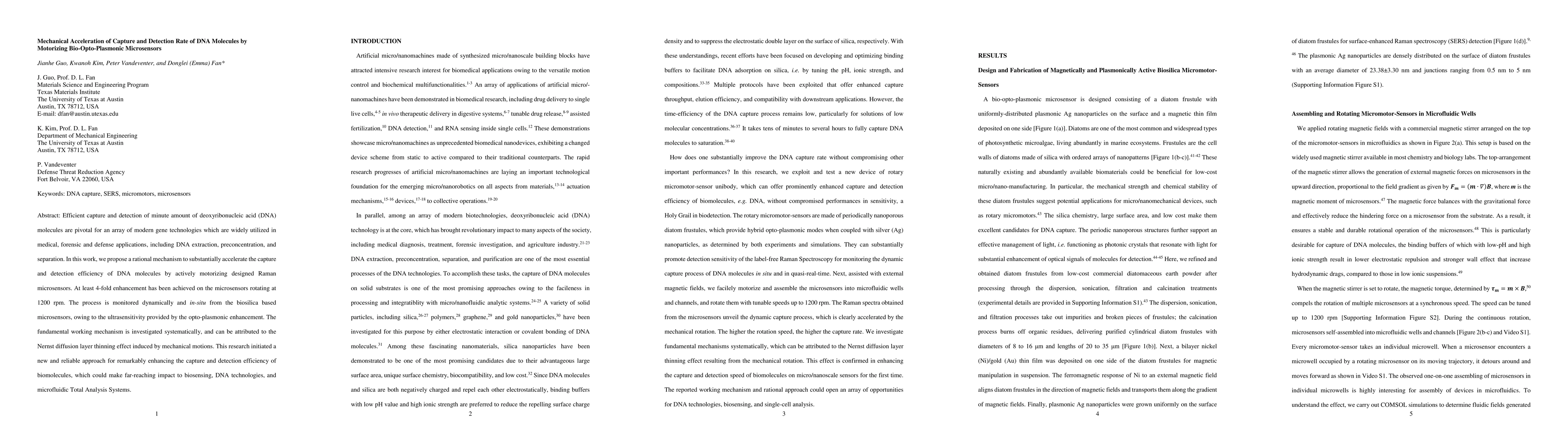 This paper proposes a mechanically accelerated method to enhance the capture and detection efficiency of DNA molecules using motorized bio-opto-plasmonic microsensors, achieving at least a 4-fold improvement. The enhanced efficiency is attributed to the Nernst diffusion layer thinning effect from mechanical rotation, offering significant advancements for biosensing and DNA technologies.