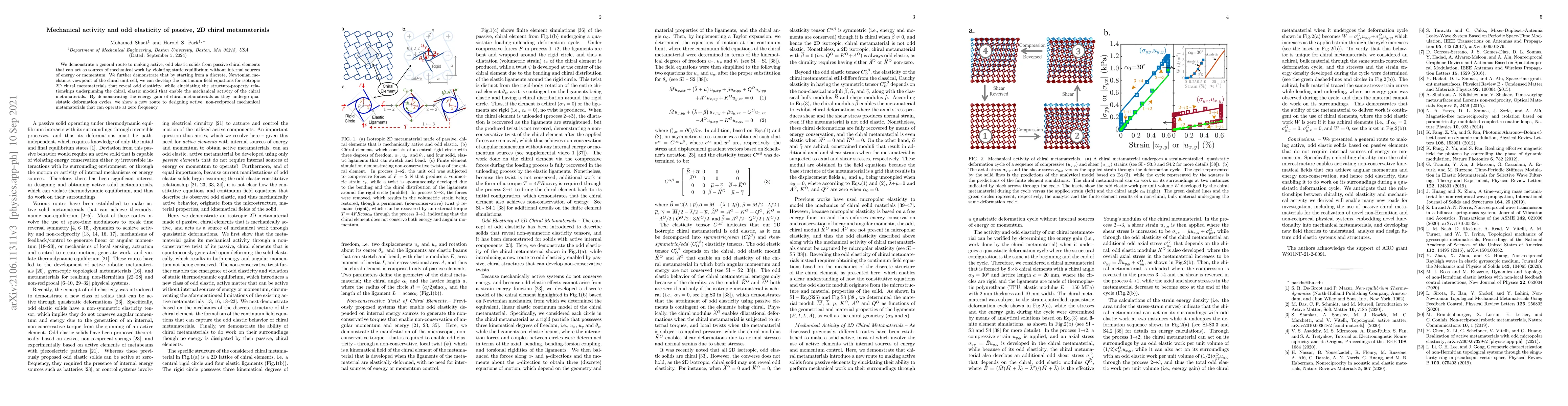 This paper presents a method for creating active, odd elastic solids from passive chiral elements, demonstrating mechanical activity without internal energy sources. It also develops continuum field equations for 2D chiral metamaterials, revealing odd elasticity and structure-property relationships, and shows energy gain through quasistatic deformation cycles.