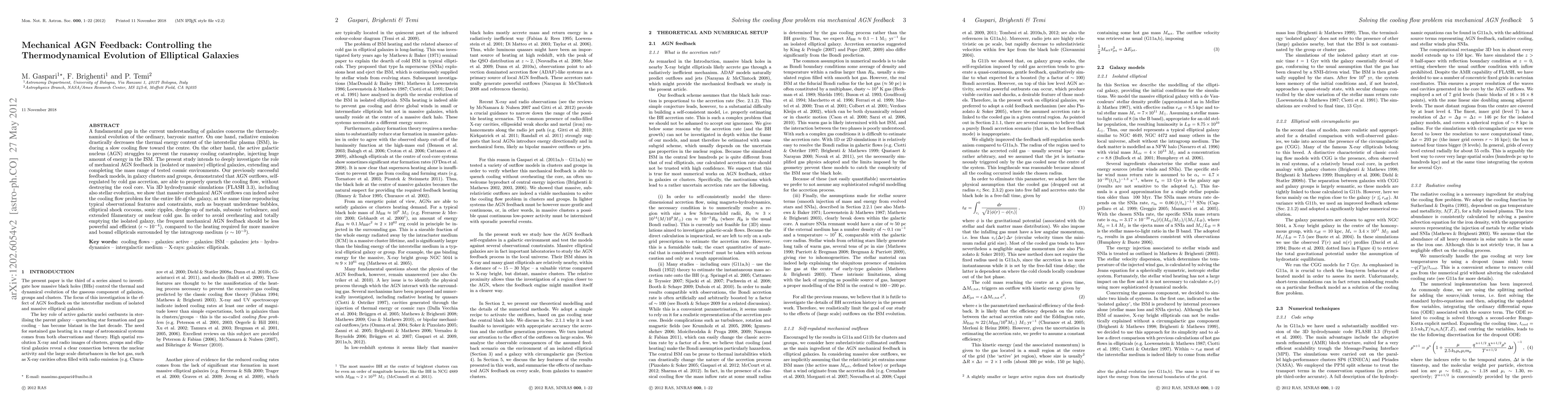A fundamental gap in the current understanding of galaxies concerns the thermodynamical evolution of the ordinary, baryonic matter. On one hand, radiative emission drastically decreases the thermal energy content of the interstellar plasma (ISM), inducing a slow cooling flow toward the centre. On the other hand, the active galactic nucleus (AGN) struggles to prevent the runaway cooling catastrophe, injecting huge amount of energy in the ISM. The present study intends to deeply investigate the role of mechanical AGN feedback in (isolated or massive) elliptical galaxies, extending and completing the mass range of tested cosmic environments. Our previously successful feedback models, in galaxy clusters and groups, demonstrated that AGN outflows, self-regulated by cold gas accretion, are able to properly quench the cooling flow, without destroying the cool core. Via 3D hydrodynamic simulations (FLASH 3.3), including also stellar evolution, we show that massive mechanical AGN outflows can indeed solve the cooling flow problem for the entire life of the galaxy, at the same time reproducing typical observational features and constraints, such as buoyant underdense bubbles, elliptical shock cocoons, sonic ripples, dredge-up of metals, subsonic turbulence, and extended filamentary or nuclear cold gas. In order to avoid overheating and totally emptying the isolated galaxy, the frequent mechanical AGN feedback should be less powerful and efficient (~1.e-4), compared to the heating required for more massive and bound ellipticals surrounded by the intragroup medium (efficiency ~1.e-3).