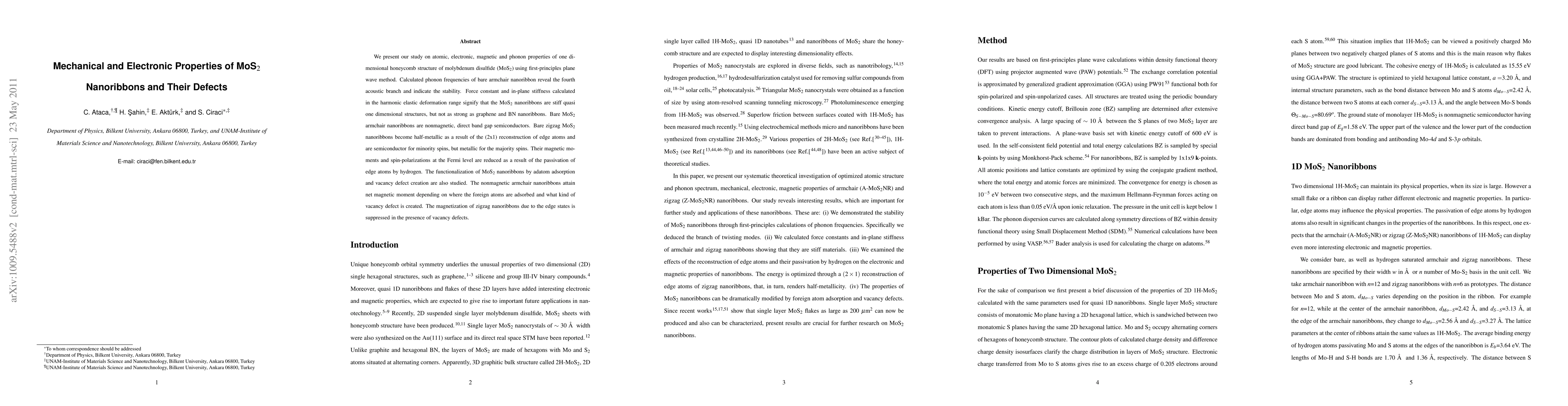 This study investigates the mechanical and electronic properties of MoS$_2$ nanoribbons using first-principles calculations. MoS$_2$ armchair nanoribbons are nonmagnetic semiconductors, while zigzag nanoribbons are half-metallic with significant spin polarization, which diminishes with hydrogen passivation. Defects and adatoms introduce magnetism, altering electronic and magnetic characteristics.
