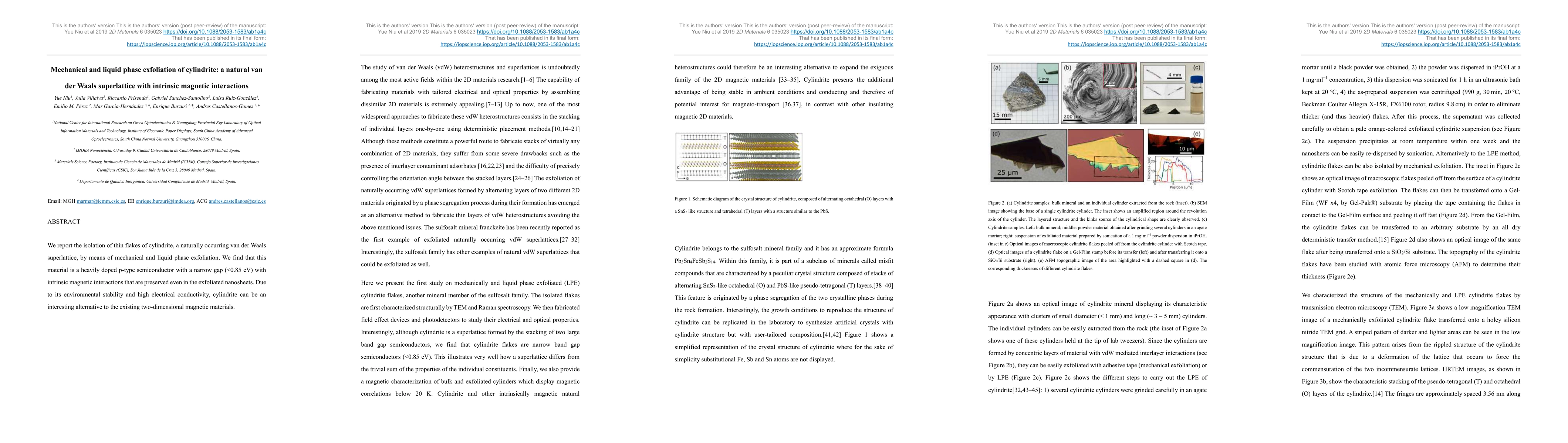 We report the isolation of thin flakes of cylindrite, a naturally occurring van der Waals superlattice, by means of mechanical and liquid phase exfoliation. We find that this material is a heavily doped p-type semiconductor with a narrow gap (<0.85 eV) with intrinsic magnetic interactions that are preserved even in the exfoliated nanosheets. Due to its environmental stability and high electrical conductivity, cylindrite can be an interesting alternative to the existing two-dimensional magnetic materials.