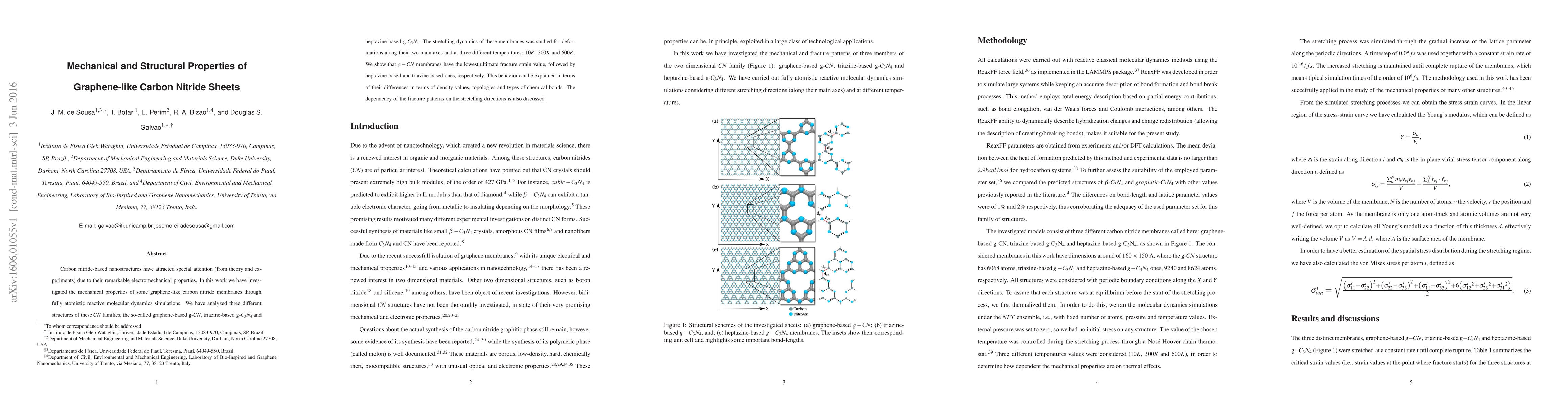 Carbon nitride-based nanostructures have attracted special attention (from theory and experiments) due to their remarkable electromechanical properties. In this work we have investigated the mechanical properties of some graphene-like carbon nitride membranes through fully atomistic reactive molecular dynamics simulations. We have analyzed three different structures of these CN families, the so-called graphene-based g-CN, triazine-based g-C3N4 and heptazine-based g-C3N4. The stretching dynamics of these membranes was studied for deformations along their two main axes and at three different temperatures: 10K, 300K and 600K. We show that g-CN membranes have the lowest ultimate fracture strain value, followed by heptazine-based and triazine-based ones, respectively. This behavior can be explained in terms of their differences in terms of density values, topologies and types of chemical bonds. The dependency of the fracture patterns on the stretching directions is also discussed.