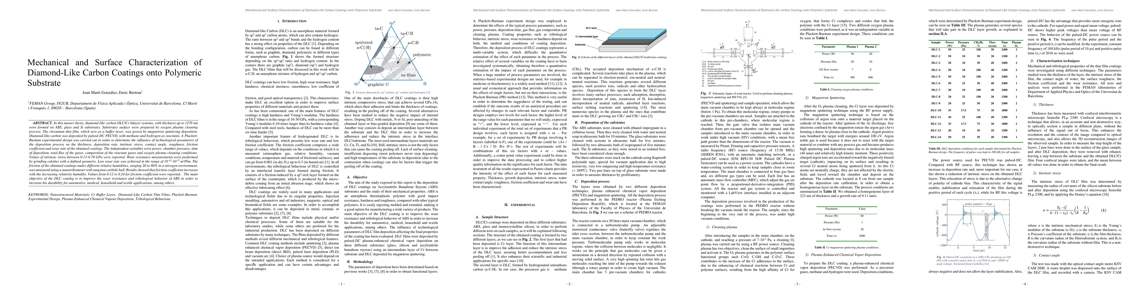This study investigates the mechanical and surface properties of diamond-like carbon (DLC) coatings on ABS, glass, and Si substrates, deposited via pulsed-DC PECVD. The research highlights the influence of deposition parameters on coating characteristics, achieving low wear rates and variable friction coefficients under varying humidity levels.