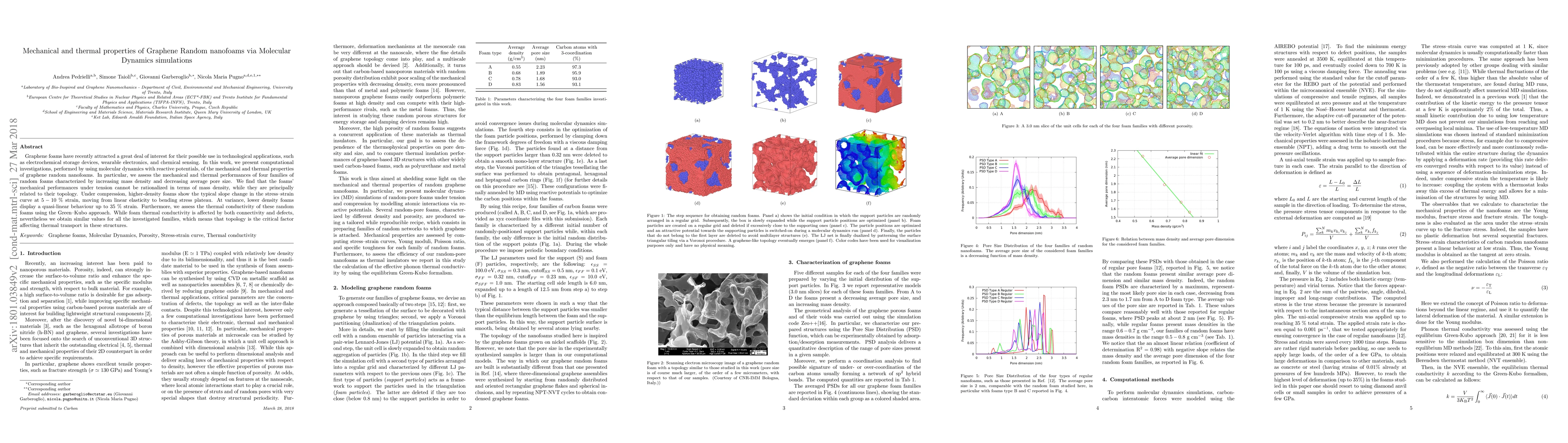 This study investigates the mechanical and thermal properties of graphene random nanofoams via molecular dynamics simulations. The research finds that mechanical performance under tension is topology-dependent, while compression behavior varies with density, and thermal conductivity remains similar across different foam densities despite varying connectivity and defect levels.