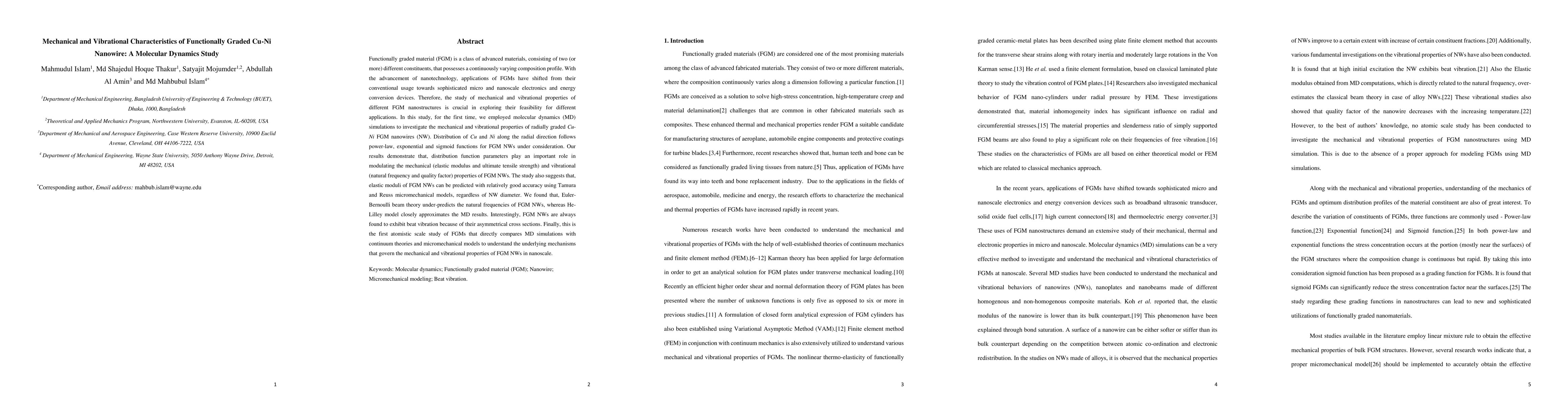 This study uses molecular dynamics simulations to explore the mechanical and vibrational properties of radially graded Cu-Ni FGM nanowires, revealing that distribution functions significantly influence their elastic and vibrational characteristics. The research also compares continuum models and micromechanical theories to predict FGM NW properties, finding that He-Lilley model better approximates natural frequencies than Euler-Bernoulli beam theory.