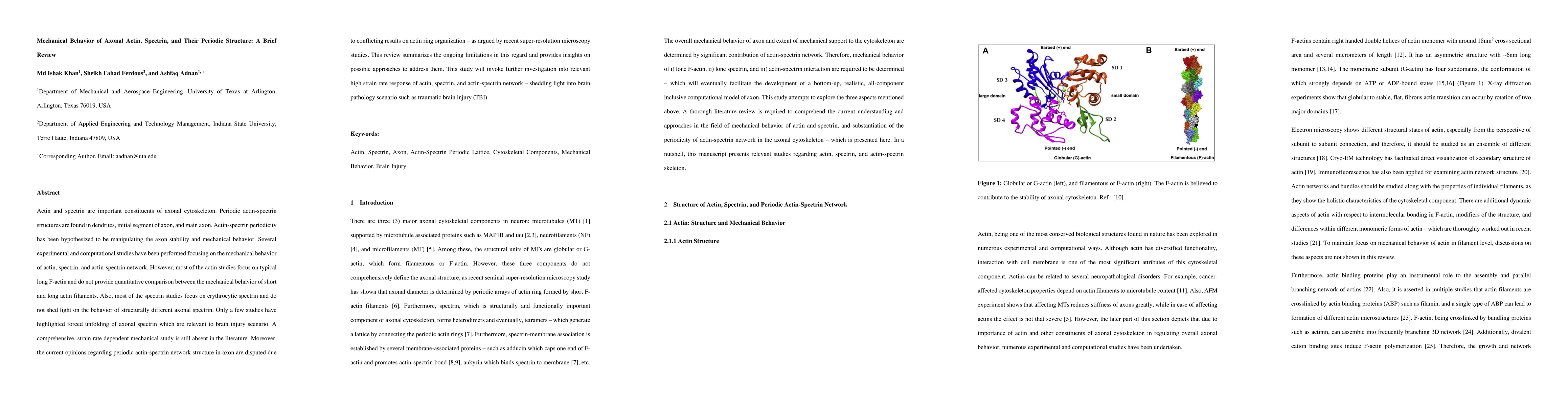 Actin and spectrin are important constituents of axonal cytoskeleton. Periodic actin and spectrin structures are found in dendrites, initial segment of axon, and main axon. Actin and spectrin periodicity has been hypothesized to be manipulating the axon stability and mechanical behavior. Several experimental and computational studies have been performed focusing on the mechanical behavior of actin, spectrin, and actin and spectrin network. However, most of the actin studies focus on typical long F actin and do not provide quantitative comparison between the mechanical behavior of short and long actin filaments. Also, most of the spectrin studies focus on erythrocytic spectrin and do not shed light on the behavior of structurally different axonal spectrin. Only a few studies have highlighted forced unfolding of axonal spectrin which are relevant to brain injury scenario. A comprehensive, strain rate dependent mechanical study is still absent in the literature. Moreover, the current opinions regarding periodic actin and spectrin network structure in axon are disputed due to conflicting results on actin ring organization as argued by recent superresolution microscopy studies. This review summarizes the ongoing limitations in this regard and provides insights on possible approaches to address them. This study will invoke further investigation into relevant high strain rate response of actin, spectrin, and actin and spectrin network shedding light into brain pathology scenario such as traumatic brain injury.