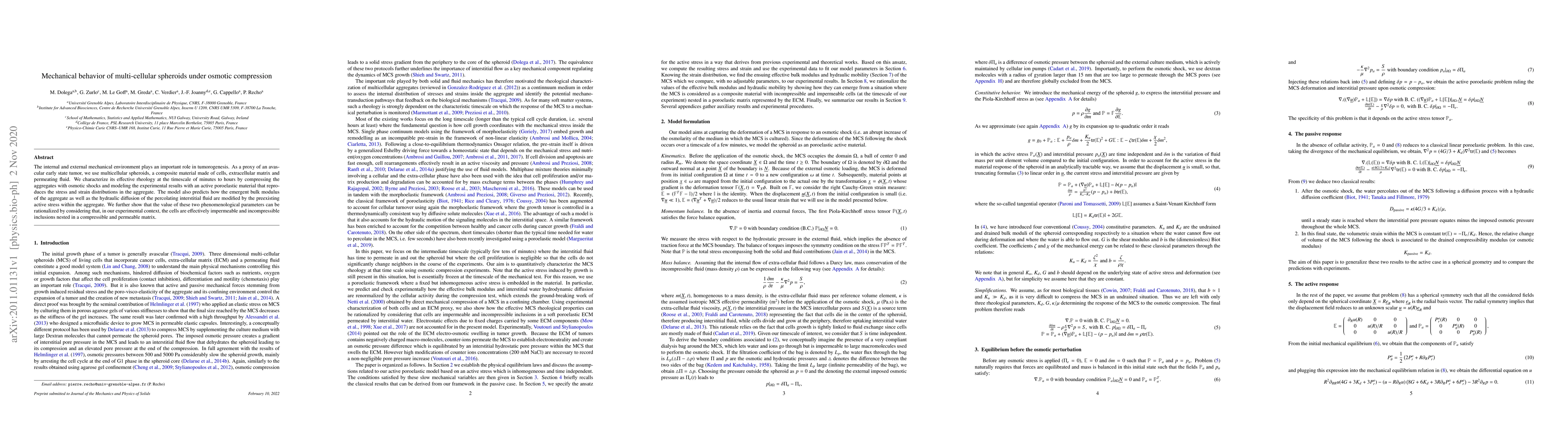 The internal and external mechanical environment plays an important role in tumorogenesis. As a proxy of an avascular early state tumor, we use multicellular spheroids, a composite material made of cells, extracellular matrix and permeating fluid. We characterize its effective rheology at the timescale of minutes to hours by compressing the aggregates with osmotic shocks and modeling the experimental results with an active poroelastic material that reproduces the stress and strain distributions in the aggregate. The model also predicts how the emergent bulk modulus of the aggregate as well as the hydraulic diffusion of the percolating interstitial fluid are modified by the preexisting active stress within the aggregate. We further show that the value of these two phenomenological parameters can be rationalized by considering that, in our experimental context, the cells are effectively impermeable and incompressible inclusions nested in a compressible and permeable matrix.
