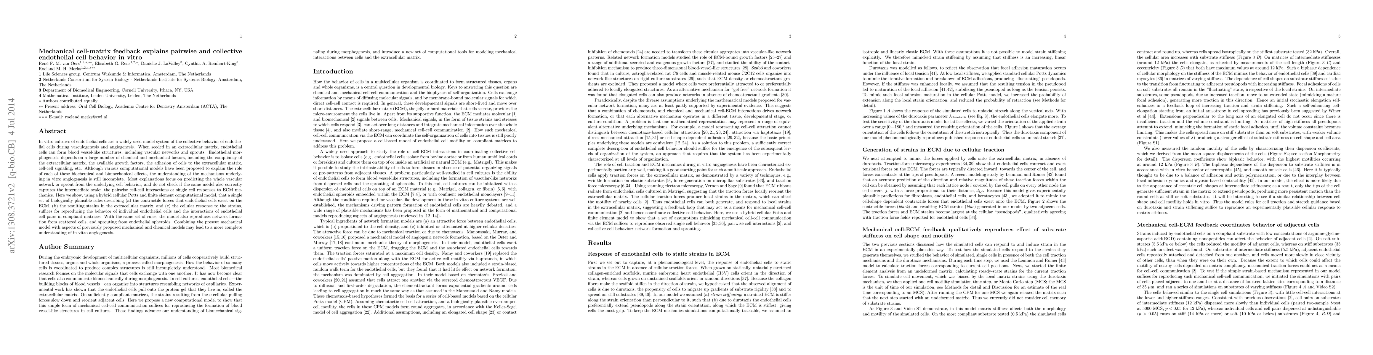 In vitro cultures of endothelial cells are a widely used model system of the collective behavior of endothelial cells during vasculogenesis and angiogenesis. When seeded in an extracellular matrix, endothelial cells can form blood vessel-like structures, including vascular networks and sprouts. Endothelial morphogenesis depends on a large number of chemical and mechanical factors, including the compliancy of the extracellular matrix, the available growth factors, the adhesion of cells to the extracellular matrix, cell-cell signaling, etc. Although various computational models have been proposed to explain the role of each of these biochemical and biomechanical effects, the understanding of the mechanisms underlying in vitro angiogenesis is still incomplete. Most explanations focus on predicting the whole vascular network or sprout from the underlying cell behavior, and do not check if the same model also correctly captures the intermediate scale: the pairwise cell-cell interactions or single cell responses to ECM mechanics. Here we show, using a hybrid cellular Potts and finite element computational model, that a single set of biologically plausible rules describing (a) the contractile forces that endothelial cells exert on the ECM, (b) the resulting strains in the extracellular matrix, and (c) the cellular response to the strains, suffices for reproducing the behavior of individual endothelial cells and the interactions of endothelial cell pairs in compliant matrices. With the same set of rules, the model also reproduces network formation from scattered cells, and sprouting from endothelial spheroids. Combining the present mechanical model with aspects of previously proposed mechanical and chemical models may lead to a more complete understanding of in vitro angiogenesis.