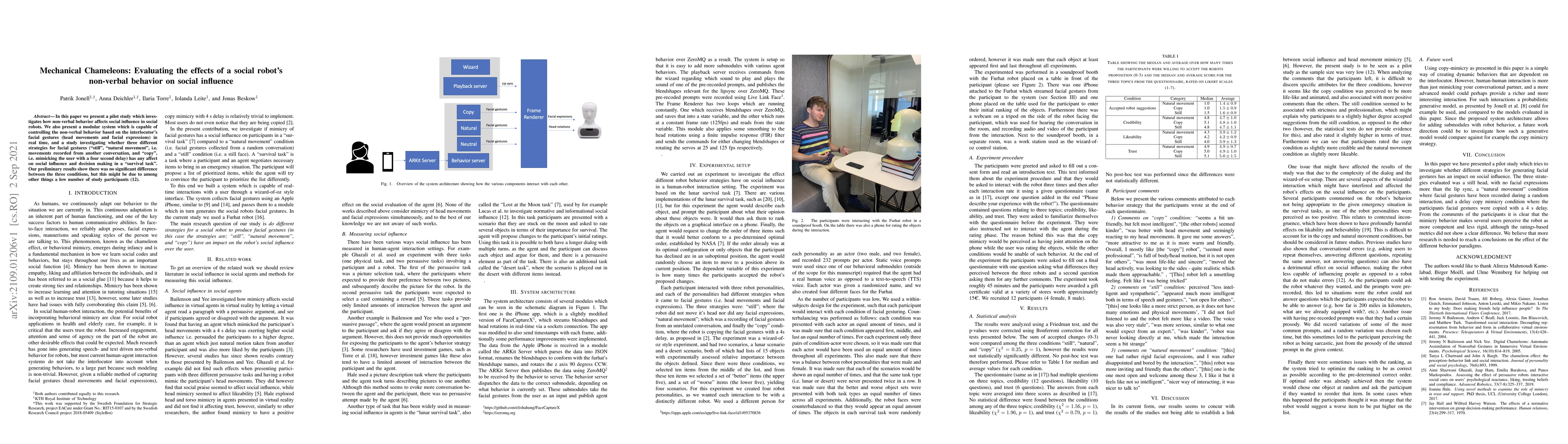 In this paper we present a pilot study which investigates how non-verbal behavior affects social influence in social robots. We also present a modular system which is capable of controlling the non-verbal behavior based on the interlocutor's facial gestures (head movements and facial expressions) in real time, and a study investigating whether three different strategies for facial gestures ("still", "natural movement", i.e. movements recorded from another conversation, and "copy", i.e. mimicking the user with a four second delay) has any affect on social influence and decision making in a "survival task". Our preliminary results show there was no significant difference between the three conditions, but this might be due to among other things a low number of study participants (12).