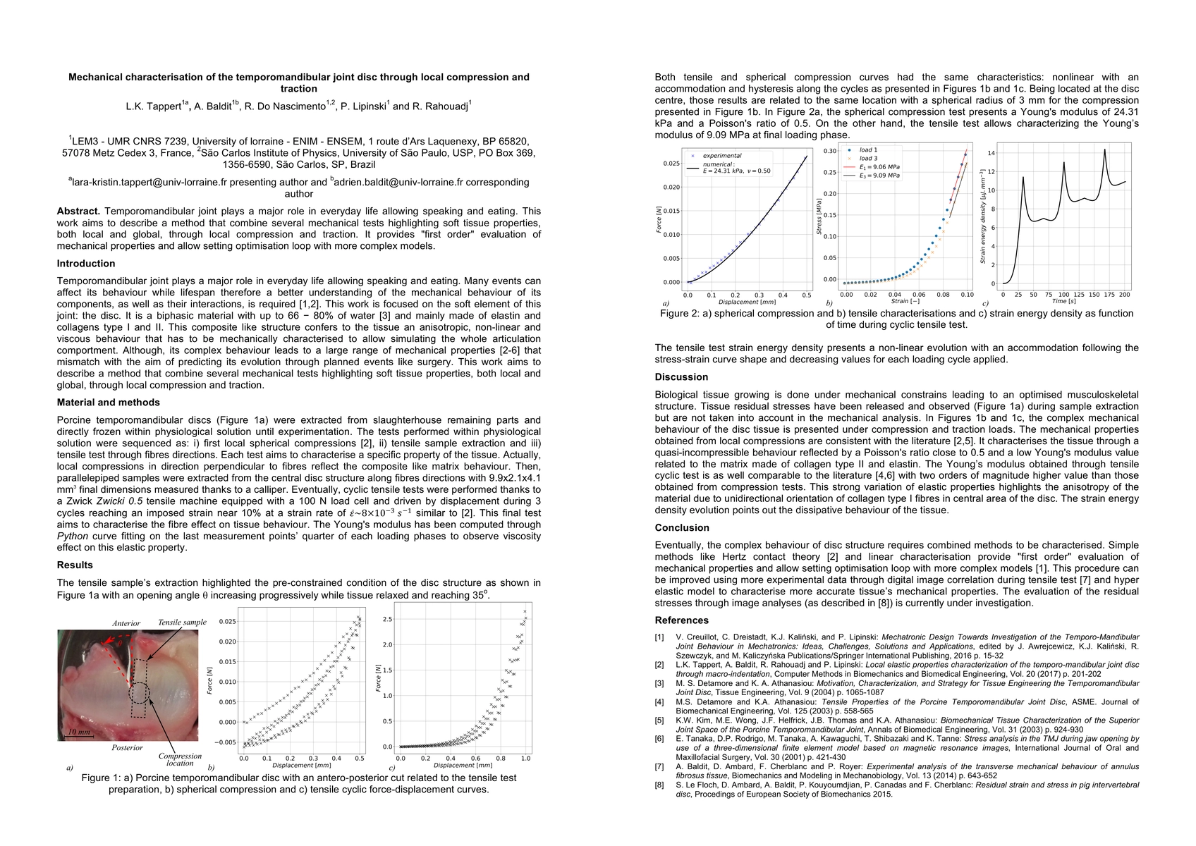 Temporomandibular joint plays a major role in everyday life allowing speaking and eating. This work aims to describe a method that combine several mechanical tests highlighting soft tissue properties, both local and global, through local compression and traction. It provides ''first order'' evaluation of mechanical properties and allow setting optimisation loop with more complex models.