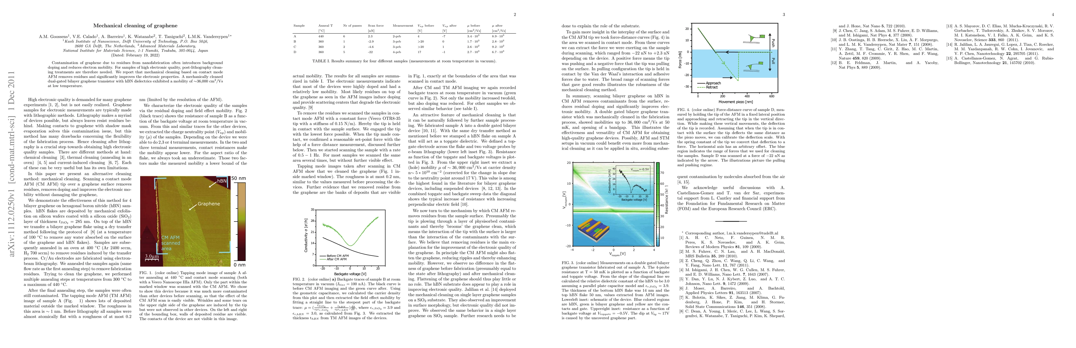 Mechanical cleaning of graphene using contact mode AFM removes residues, improving electronic properties and achieving mobility of ~36,000 cm2/Vs in a dual-gated bilayer graphene transistor.
