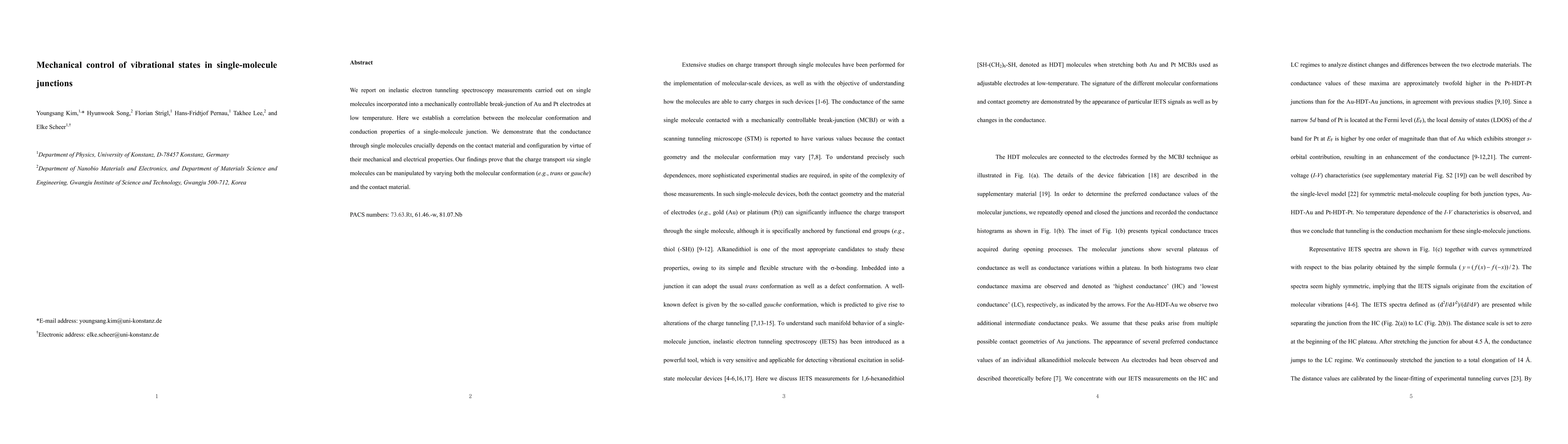 We report on inelastic electron tunneling spectroscopy measurements carried out on single molecules incorporated into a mechanically controllable break-junction of Au and Pt electrodes at low temperature. Here we establish a correlation between the molecular conformation and conduction properties of a single-molecule junction. We demonstrate that the conductance through single molecules crucially depends on the contact material and configuration by virtue of their mechanical and electrical properties. Our findings prove that the charge transport via single molecules can be manipulated by varying both the molecular conformation (e.g., trans or gauche) and the contact material.
