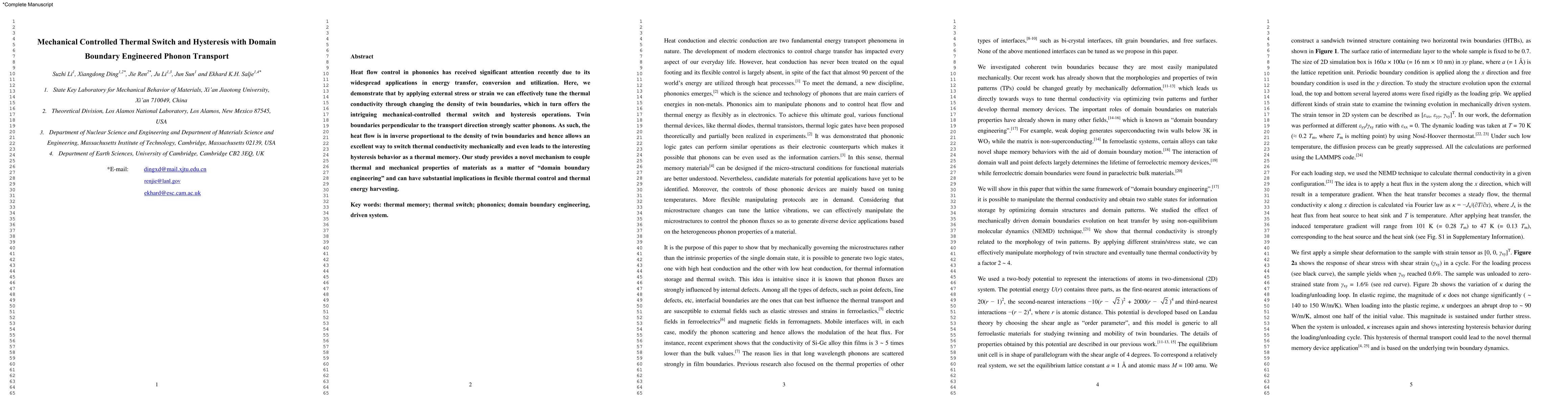 This paper demonstrates a mechanical-controlled thermal switch using engineered phonon transport by applying external stress to change the density of twin boundaries, which inversely affects thermal conductivity and exhibits hysteresis behavior. The study highlights a novel "domain boundary engineering" approach that couples thermal and mechanical properties in materials, with potential applications in flexible thermal control and energy harvesting.