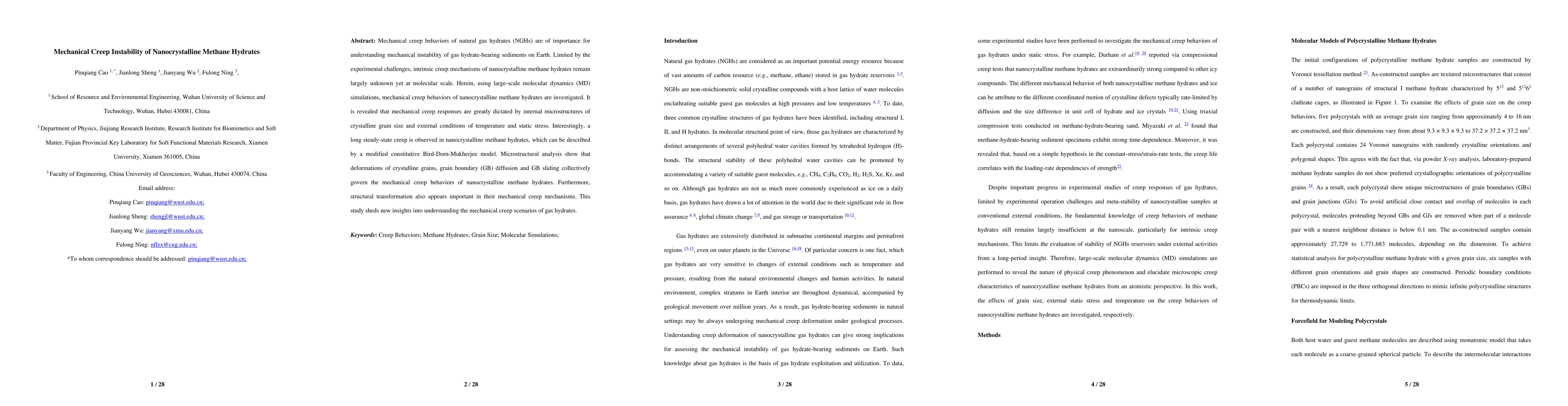 This study uses molecular dynamics simulations to investigate the mechanical creep behaviors of nanocrystalline methane hydrates, revealing that creep is influenced by grain size, temperature, and stress, with grain boundary diffusion and sliding playing key roles. The findings provide new insights into the mechanical instability of gas hydrate-bearing sediments.