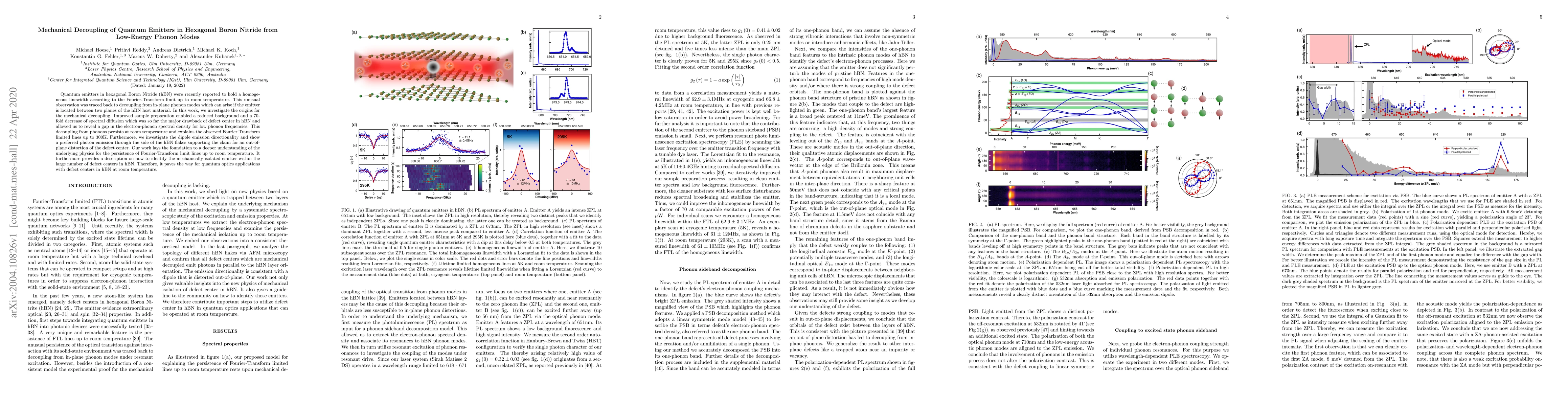 Quantum emitters in hexagonal Boron Nitride (hBN) were recently reported to hol a homogeneous linewidth according to the Fourier-Transform limit up to room temperature. This unusual observation was traced back to decoupling from in-plane phonon modes which can arise if the emitter is located between two planes of the hBN host material. In this work, we investigate the origins for the mechanical decoupling. Improved sample preparation enabled a reduced background and a 70-fold decrease of spectral diffusion which was so far the major drawback of defect center in hBN and allowed us to reveal a gap in the electron-phonon spectral density for low phonon frequencies. This decoupling from phonons persists at room temperature and explains the observed Fourier Transform limited lines up to 300K. Furthermore, we investigate the dipole emission directionality and show a preferred photon emission through the side of the hBN flakes supporting the claim for an out-of-plane distortion of the defect center. Our work lays the foundation to a deeper understanding of the underlying physics for the persistence of Fourier-Transform limit lines up to room temperature. It furthermore provides a description on how to identify the mechanically isolated emitter within the large number of defect centers in hBN. Therefore, it paves the way for quantum optics applications with defect centers in hBN at room temperature.