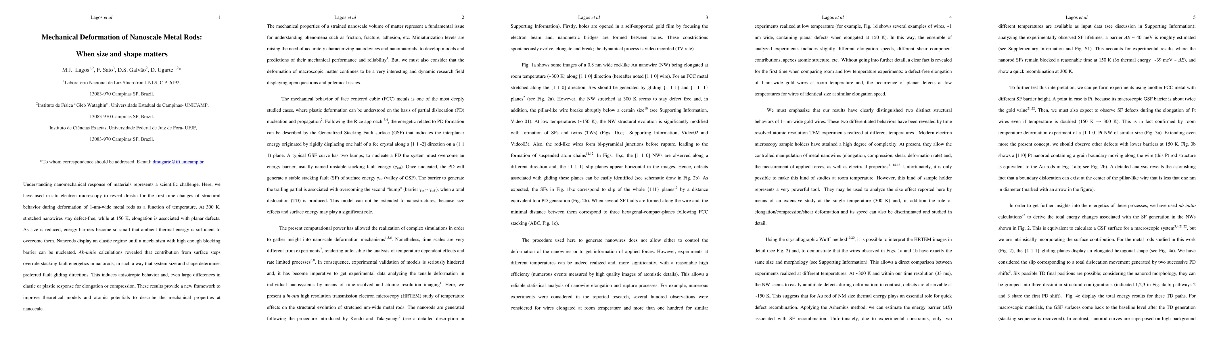 Understanding nanomechanical response of materials represents a scientific challenge. Here, we have used in-situ electron microscopy to reveal drastic for the first time changes of structural behavior during deformation of 1-nm-wide metal rods as a function of temperature. At 300 K, stretched nanowires stay defect-free, while at 150 K, elongation is associated with planar defects. As size is reduced, energy barriers become so small that ambient thermal energy is sufficient to overcome them. Nanorods display an elastic regime until a mechanism with high enough blocking barrier can be nucleated. Ab-initio calculations revealed that contribution from surface steps overrule stacking fault energetics in nanorods, in such a way that system size and shape determines preferred fault gliding directions. This induces anisotropic behavior and, even large differences in elastic or plastic response for elongation or compression. These results provide a new framework to improve theoretical models and atomic potentials to describe the mechanical properties at nanoscale.