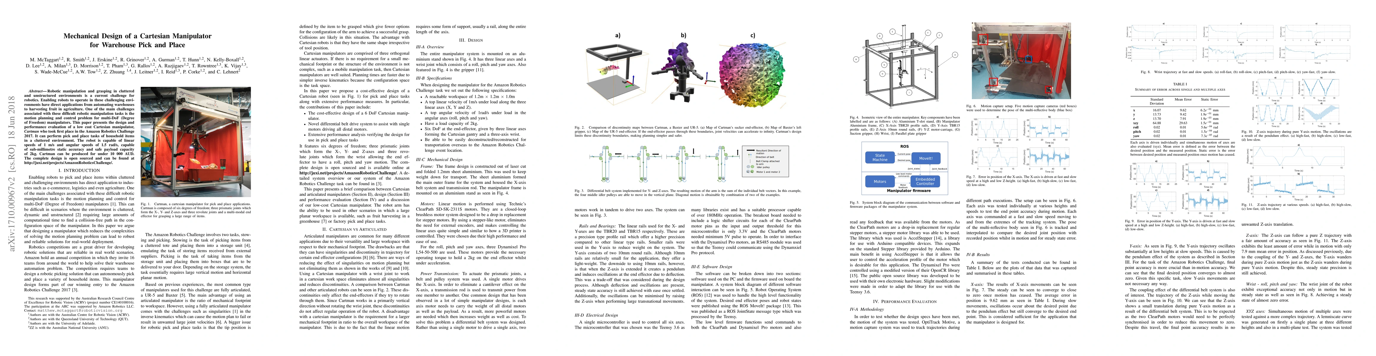 Robotic manipulation and grasping in cluttered and unstructured environments is a current challenge for robotics. Enabling robots to operate in these challenging environments have direct applications from automating warehouses to harvesting fruit in agriculture. One of the main challenges associated with these difficult robotic manipulation tasks is the motion planning and control problem for multi-DoF (Degree of Freedom) manipulators. This paper presents the design and performance evaluation of a low-cost Cartesian manipulator, Cartman who took first place in the Amazon Robotics Challenge 2017. It can perform pick and place tasks of household items in a cluttered environment. The robot is capable of linear speeds of 1 m/s and angular speeds of 1.5 rad/s, capable of sub-millimetre static accuracy and safe payload capacity of 2kg. Cartman can be produced for under 10 000 AUD. The complete design is open sourced and can be found at http://juxi.net/projects/AmazonRoboticsChallenge.