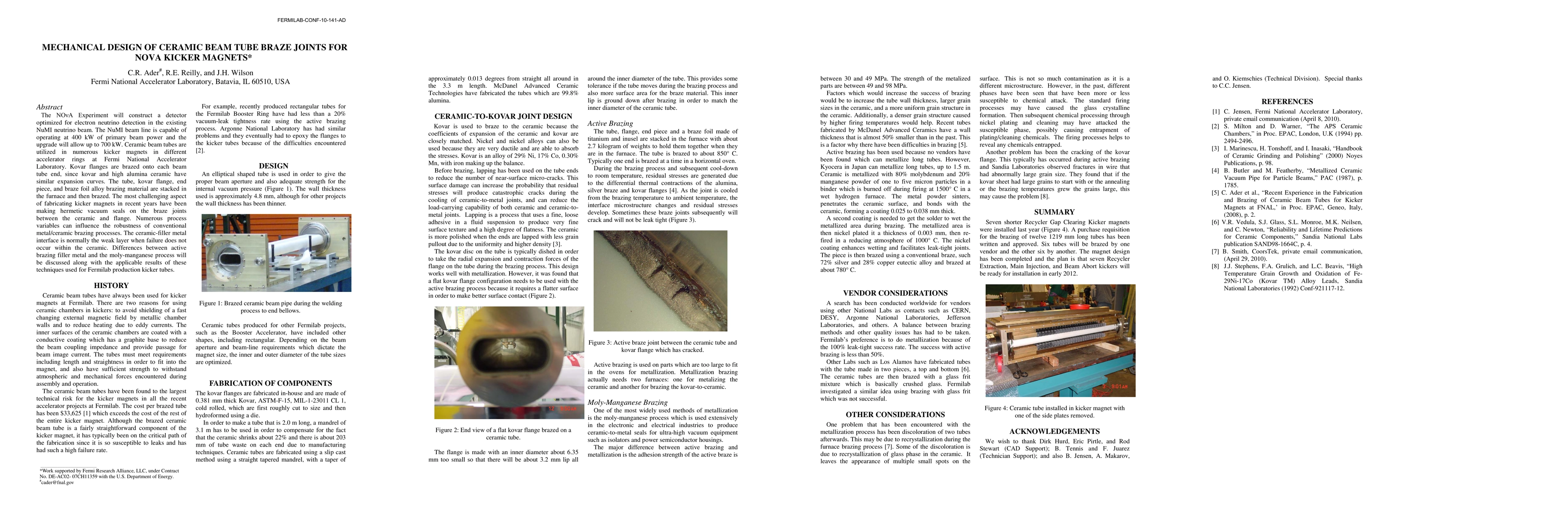The NO{\nu}A Experiment will construct a detector optimized for electron neutrino detection in the existing NuMI neutrino beam. The NuMI beam line is capable of operating at 400 kW of primary beam power and the upgrade will allow up to 700 kW. Ceramic beam tubes are utilized in numerous kicker magnets in different accelerator rings at Fermi National Accelerator Laboratory. Kovar flanges are brazed onto each beam tube end, since kovar and high alumina ceramic have similar expansion curves. The tube, kovar flange, end piece, and braze foil alloy brazing material are stacked in the furnace and then brazed. The most challenging aspect of fabricating kicker magnets in recent years have been making hermetic vacuum seals on the braze joints between the ceramic and flange. Numerous process variables can influence the robustness of conventional metal/ceramic brazing processes. The ceramic-filler metal interface is normally the weak layer when failure does not occur within the ceramic. Differences between active brazing filler metal and the moly-manganese process will be discussed along with the applicable results of these techniques used for Fermilab production kicker tubes.