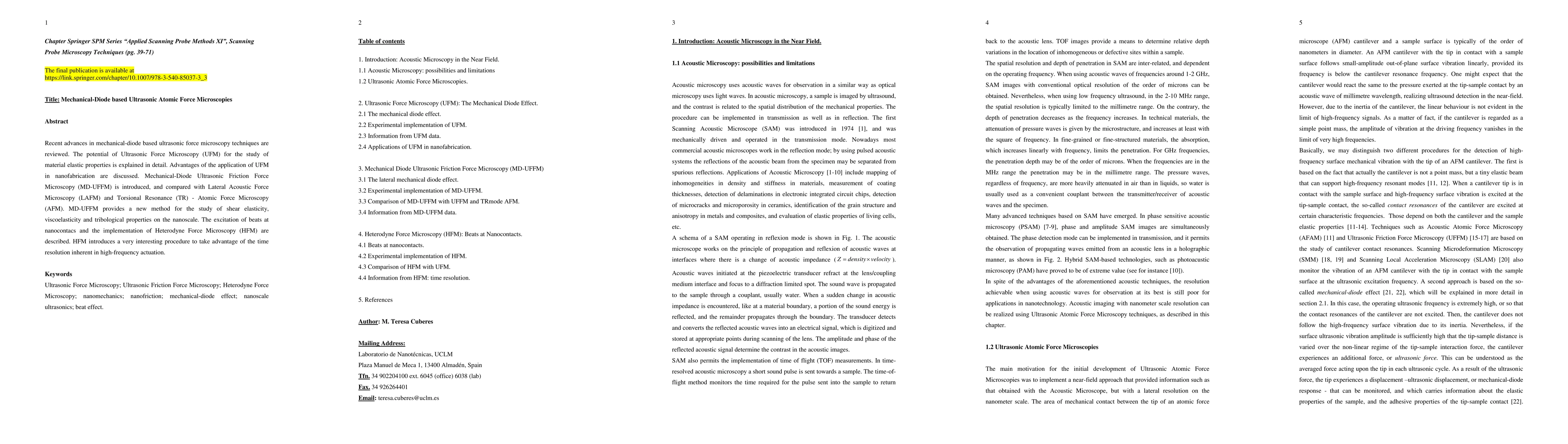 Recent advances in mechanical-diode based ultrasonic force microscopy techniques are reviewed. The potential of Ultrasonic Force Microscopy (UFM) for the study of material elastic properties is explained in detail. Advantages of the application of UFM in nanofabrication are discussed. Mechanical-Diode Ultrasonic Friction Force Microscopy (MD-UFFM) is introduced, and compared with Lateral Acoustic Force Microscopy (LAFM) and Torsional Resonance (TR) - Atomic Force Microscopy (AFM). MD-UFFM provides a new method for the study of shear elasticity, viscoelasticity and tribological properties on the nanoscale. The excitation of beats at nanocontacs and the implementation of Heterodyne Force Microscopy (HFM) are described. HFM introduces a very interesting procedure to take advantage of the time resolution inherent in high-frequency actuation.