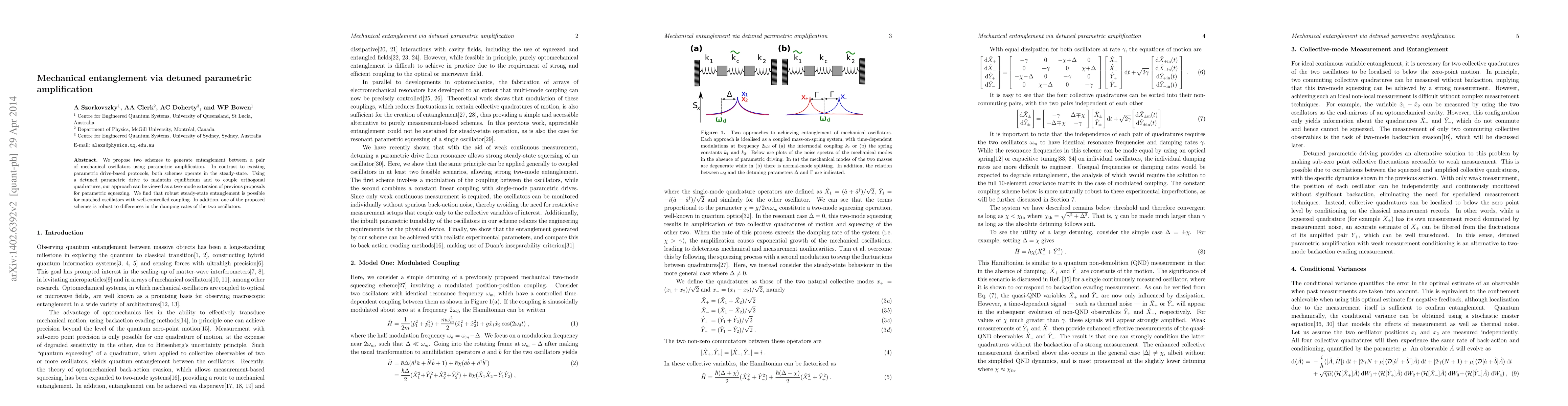 This paper proposes two steady-state schemes for generating entanglement between mechanical oscillators via detuned parametric amplification, offering robustness against damping rate differences in one scheme and extending previous parametric squeezing proposals.