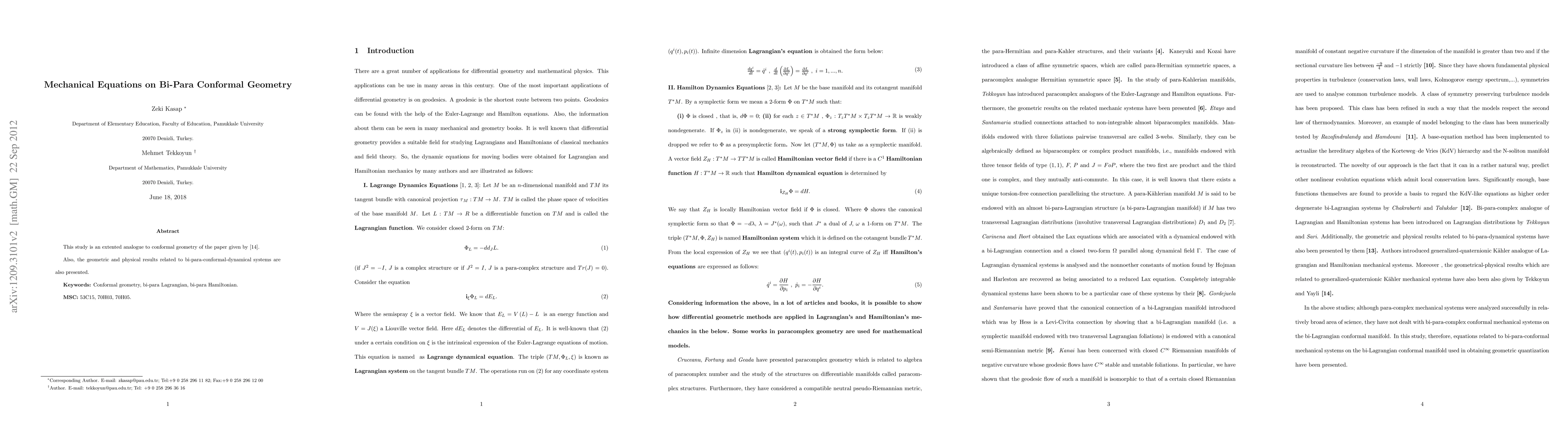 Summary: This research extends the principles of conformal geometry to bi-para conformal geometry, presenting new geometric and physical results for bi-para-conformal dynamical systems. The study builds on the foundational work of [14].
