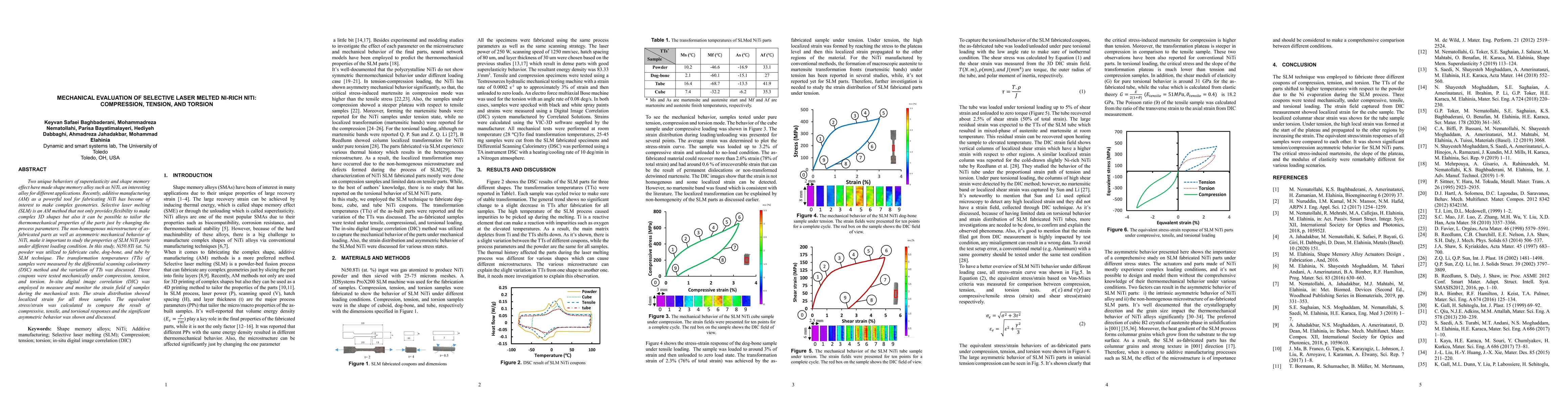 This study investigates the mechanical properties of Ni-rich NiTi fabricated by selective laser melting (SLM) under compression, tension, and torsion. Results show significant asymmetric mechanical behavior and localized strain distribution, highlighting the importance of process parameters in tailoring the thermomechanical properties of SLM-produced NiTi.