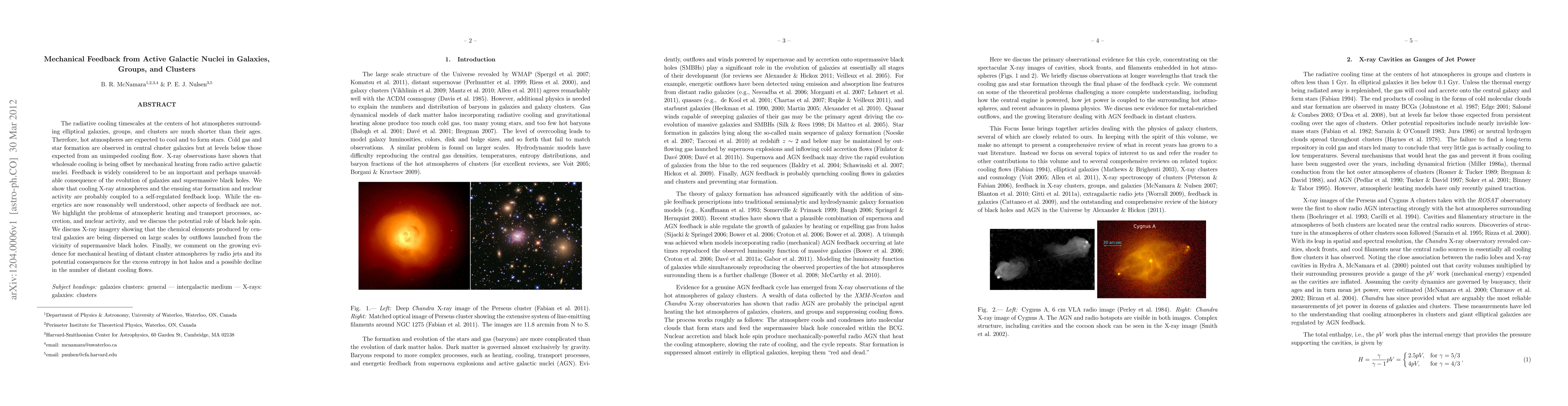 This paper investigates the mechanical feedback from active galactic nuclei (AGN) in galaxies, groups, and clusters, demonstrating that AGN heating offsets the expected cooling and star formation in hot atmospheres. It highlights the self-regulated feedback loop coupling cooling, star formation, and nuclear activity, and discusses the role of black hole spin and the dispersal of chemical elements via AGN outflows.