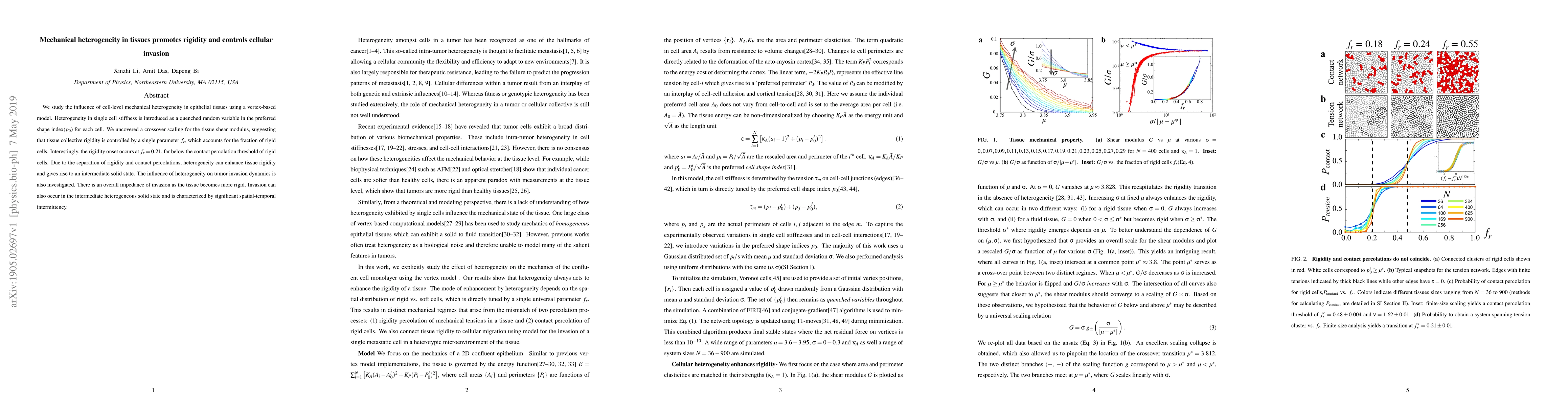 We study the influence of cell-level mechanical heterogeneity in epithelial tissues using a vertex-based model. Heterogeneity in single cell stiffness is introduced as a quenched random variable in the preferred shape index($p_0$) for each cell. We uncovered a crossover scaling for the tissue shear modulus, suggesting that tissue collective rigidity is controlled by a single parameter $f_r$, which accounts for the fraction of rigid cells. Interestingly, the rigidity onset occurs at $f_r=0.21$, far below the contact percolation threshold of rigid cells. Due to the separation of rigidity and contact percolations, heterogeneity can enhance tissue rigidity and gives rise to an intermediate solid state. The influence of heterogeneity on tumor invasion dynamics is also investigated. There is an overall impedance of invasion as the tissue becomes more rigid. Invasion can also occur in the intermediate heterogeneous solid state and is characterized by significant spatial-temporal intermittency.