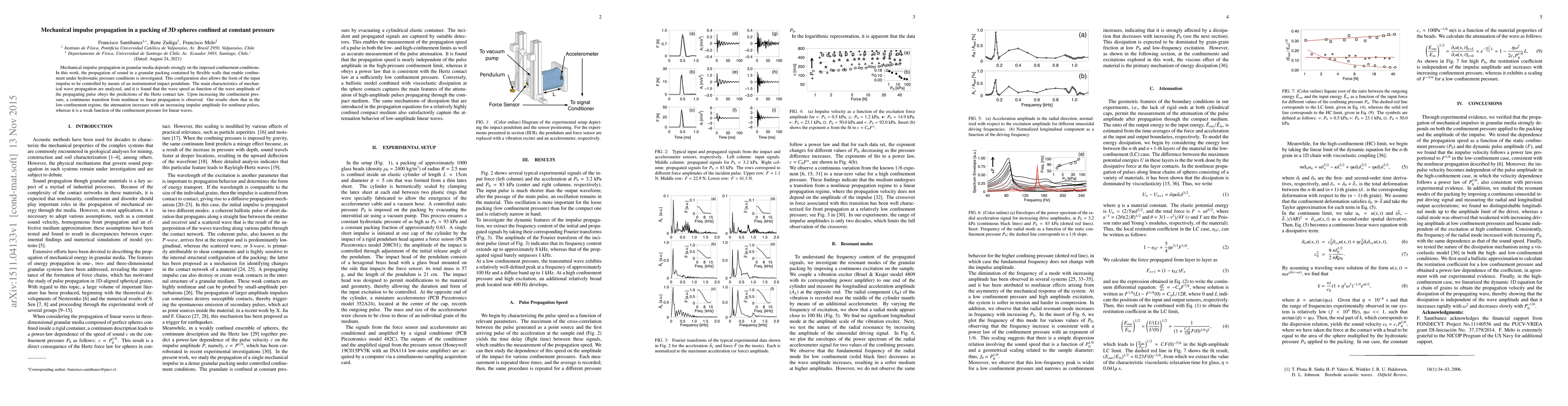 This study investigates mechanical impulse propagation in a 3D sphere packing under constant pressure, revealing that wave speed depends on pulse amplitude and follows Hertz contact law. Increased confinement pressure transitions wave propagation from nonlinear to linear, with attenuation varying with impulse amplitude and pressure.