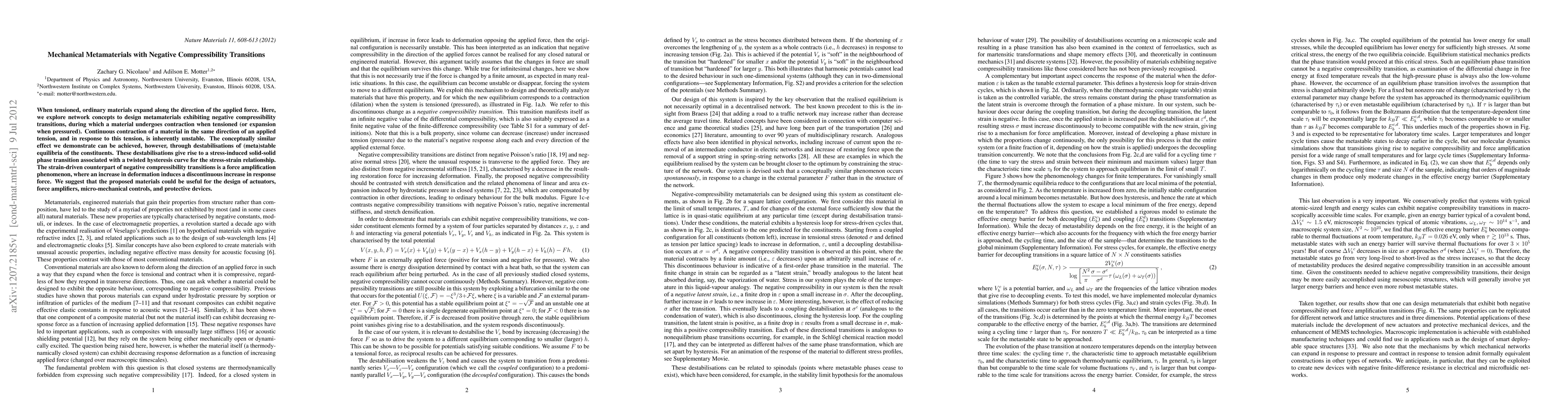 This paper explores the design of mechanical metamaterials that exhibit negative compressibility, where the material contracts when tensioned, achieved through destabilizing stable equilibria in the material's network structure. These materials could potentially be used in actuators, force amplifiers, and protective devices.