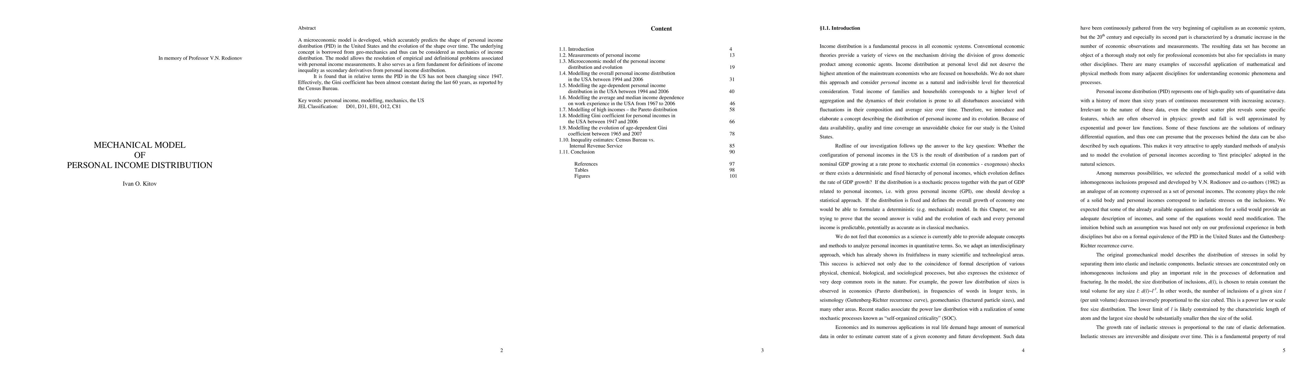 A microeconomic model is developed, which accurately predicts the shape of personal income distribution (PID) in the United States and the evolution of the shape over time. The underlying concept is borrowed from geo-mechanics and thus can be considered as mechanics of income distribution. The model allows the resolution of empirical and definitional problems associated with personal income measurements. It also serves as a firm fundament for definitions of income inequality as secondary derivatives from personal income distribution. It is found that in relative terms the PID in the US has not been changing since 1947. Effectively, the Gini coefficient has been almost constant during the last 60 years, as reported by the Census Bureau.
