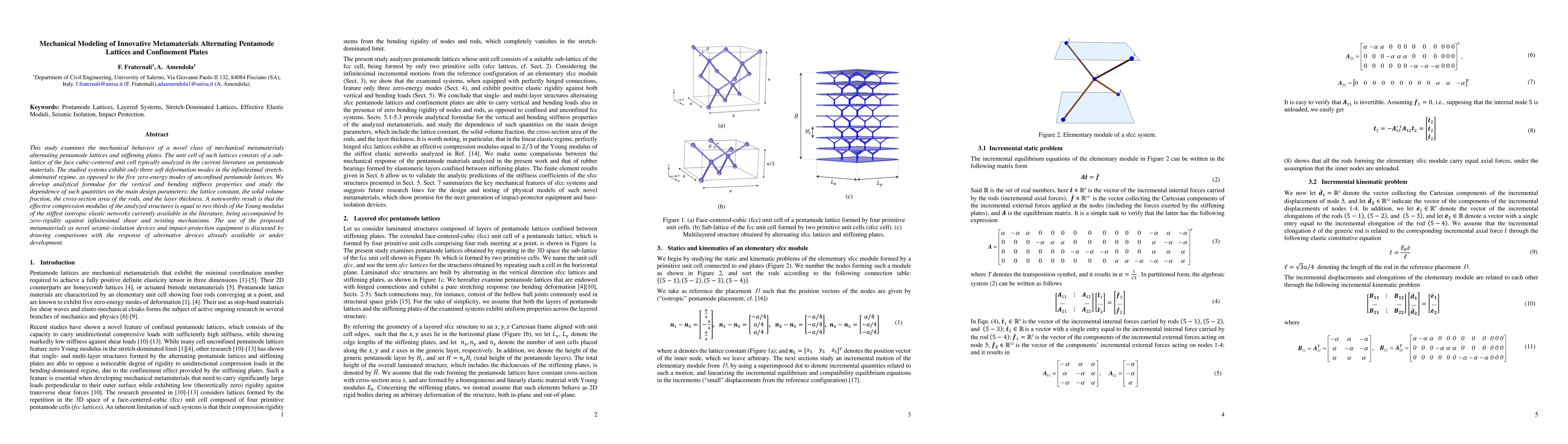 This study investigates the mechanical properties of innovative metamaterials composed of alternating pentamode lattices and confinement plates, revealing three soft deformation modes and a compression modulus two-thirds of the Young modulus of stiff isotropic networks. The research develops analytical models to understand the impact of design parameters on vertical and bending stiffness, suggesting potential applications in seismic isolation and impact protection.