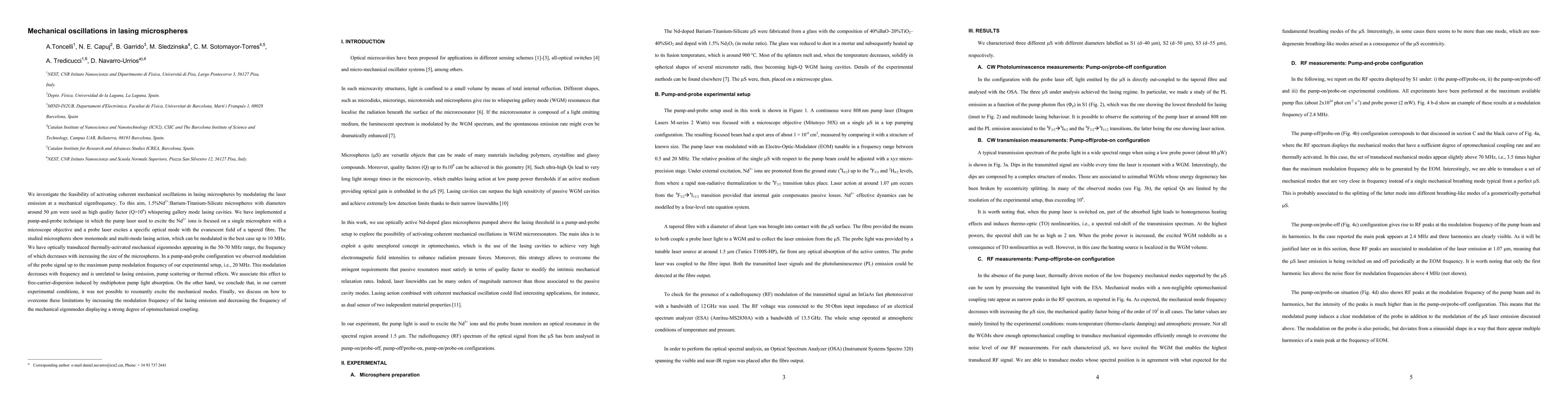 We investigate the feasibility of activating coherent mechanical oscillations in lasing microspheres by modulating the laser emission at a mechanical eigenfrequency. To this aim, 1.5% Nd3+:Barium-Titanium-Silicate microspheres with diameters around 50 {\mu}m were used as high quality factor (Q>10^6) whispering gallery mode lasing cavities. We have implemented a pump-and-probe technique in which the pump laser used to excite the Nd3+ ions is focused on a single microsphere with a microscope objective and a probe laser excites a specific optical mode with the evanescent field of a tapered fibre. The studied microspheres show monomode and multi-mode lasing action, which can be modulated in the best case up to 10 MHz. We have optically transduced thermally-activated mechanical eigenmodes appearing in the 50-70 MHz range, the frequency of which decreases with increasing the size of the microspheres. In a pump-and-probe configuration we observed modulation of the probe signal up to the maximum pump modulation frequency of our experimental setup, i.e., 20 MHz. This modulation decreases with frequency and is unrelated to lasing emission, pump scattering or thermal effects. We associate this effect to free-carrier-dispersion induced by multiphoton pump light absorption. On the other hand, we conclude that, in our current experimental conditions, it was not possible to resonantly excite the mechanical modes. Finally, we discuss on how to overcome these limitations by increasing the modulation frequency of the lasing emission and decreasing the frequency of the mechanical eigenmodes displaying a strong degree of optomechanical coupling.
